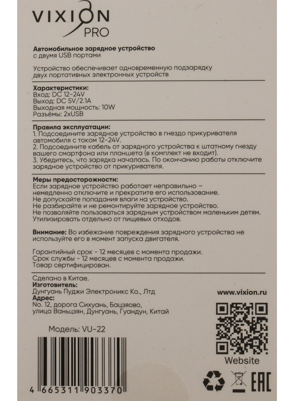 Vixion VU-22 выполнен в чёрном цвете, подключается в прикуриватель, сила тока — 2.1А, гарантия — 12 месяцев.