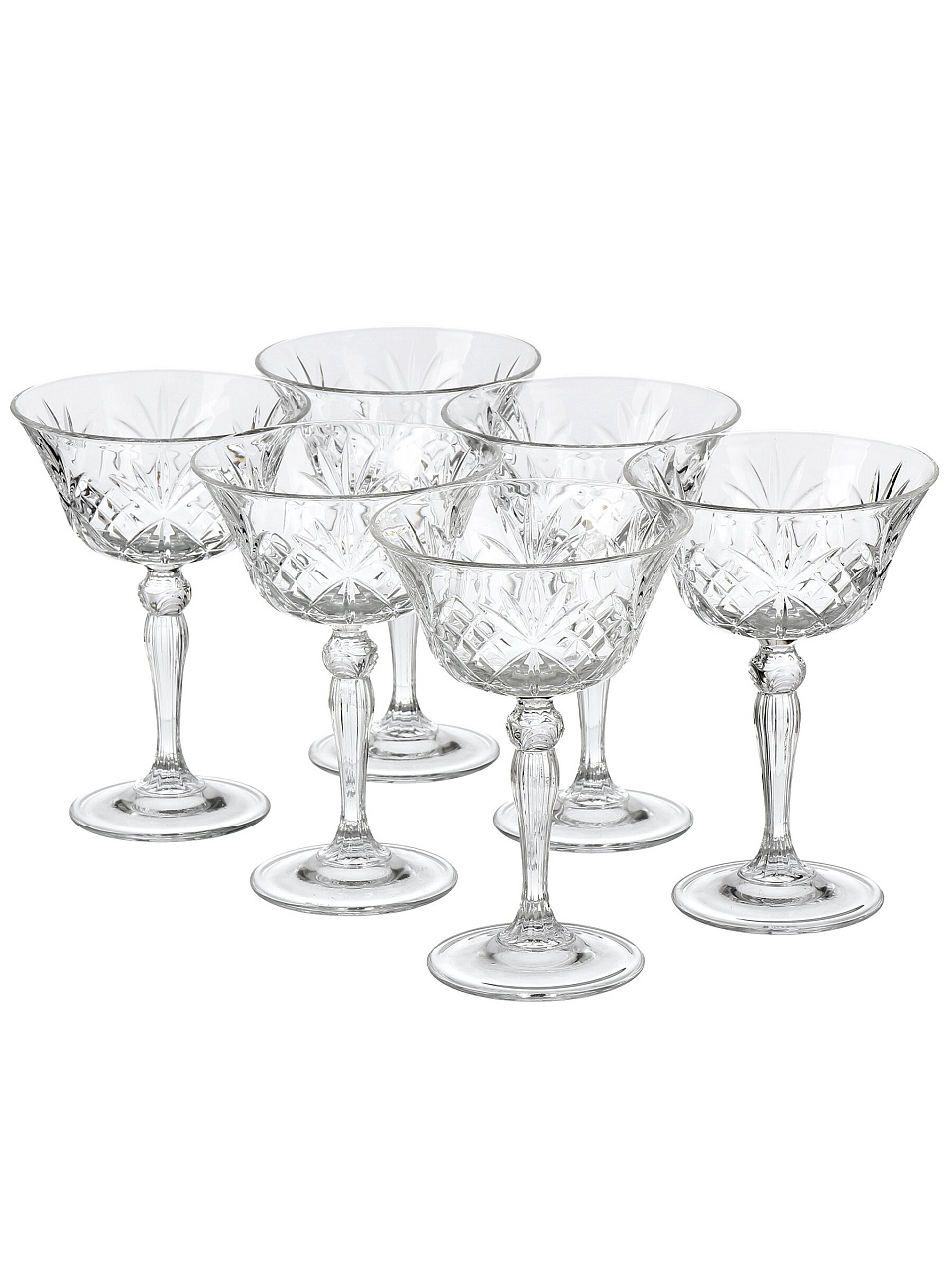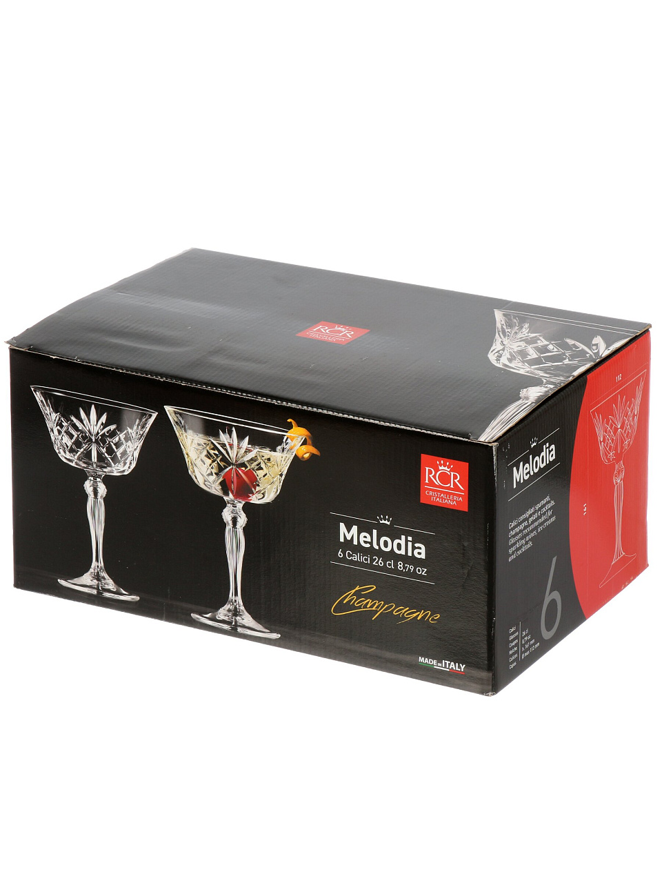 Бокалы для шампанского RCR Melodia Coppa 260 мл — идеальный набор из 6 хрустальных бокалов для праздничной сервировки и эффектного подарка. Итальянское качество, стильный рельеф, подходят для мытья в посудомоечной машине.