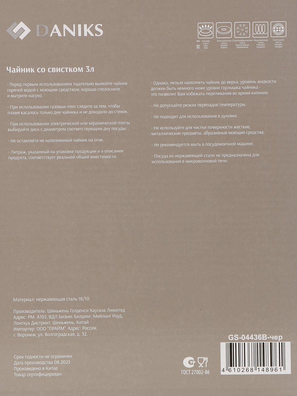 Чайник нерж, 3 л, со свист, нержавеющая сталь, с термометром, Daniks, GS-04436B