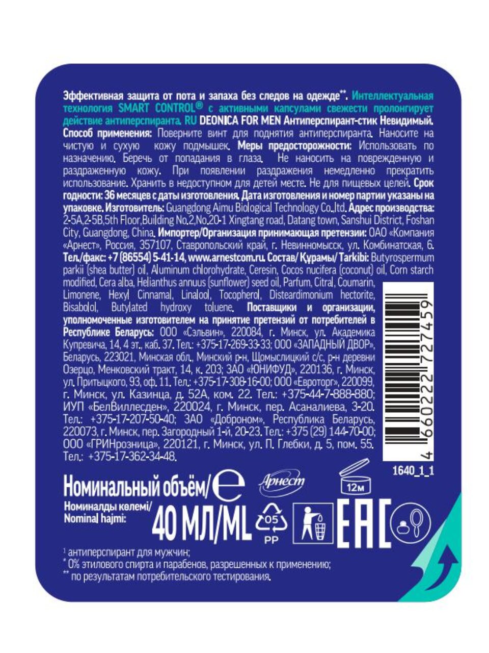 Deonica Невидимый специально разработан для предотвращения следов на светлой и тёмной одежде благодаря уникальной формуле без окрашивающих компонентов.