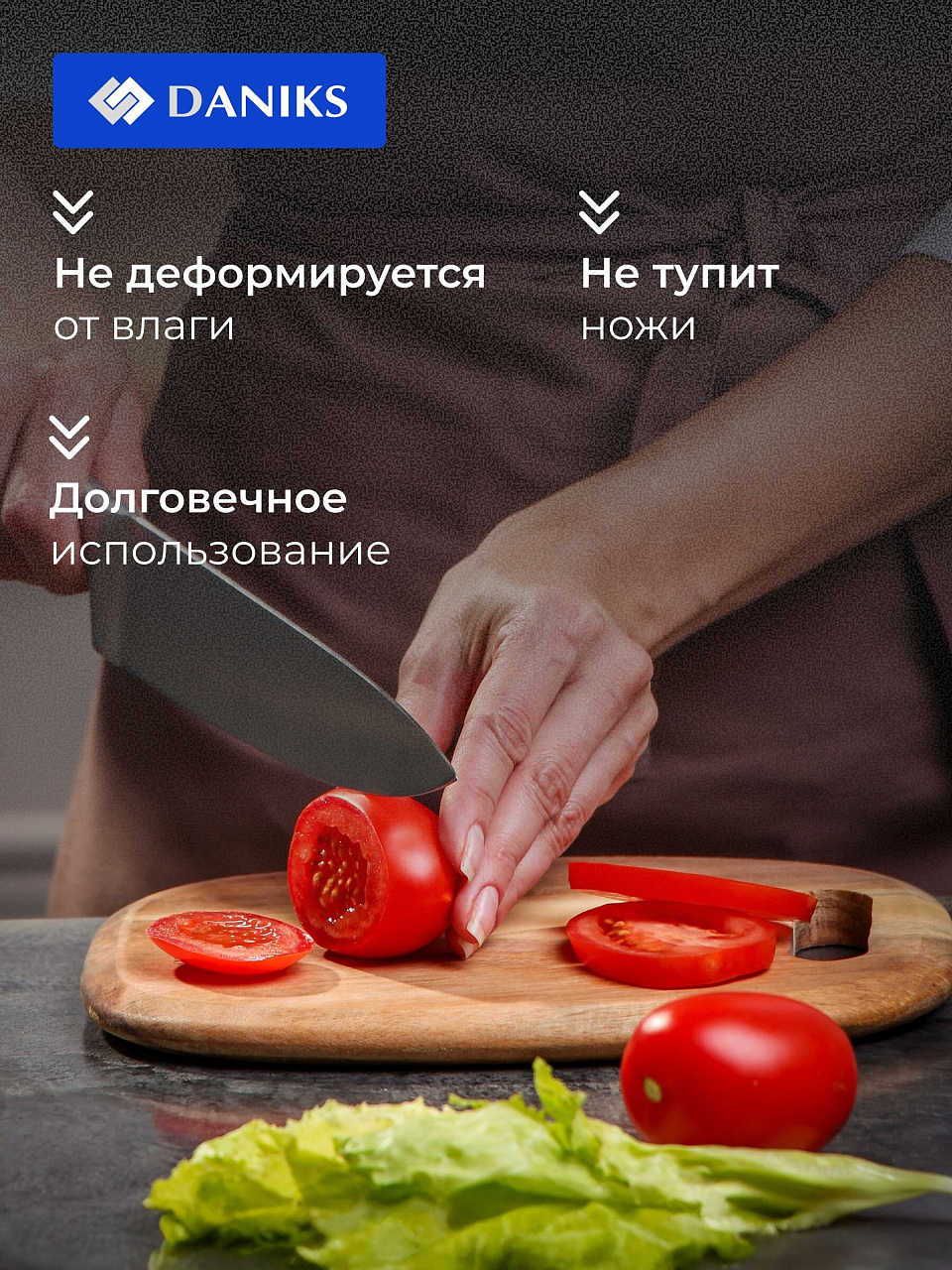 Высокая прочность, влагостойкость, устойчивость к деформациям и растрескиванию обеспечивают доске долгий срок службы, что делает ее надежным инструментом на кухне. Это позволяет использовать ее для нарезки различных продуктов без опасения повреждений или износа.