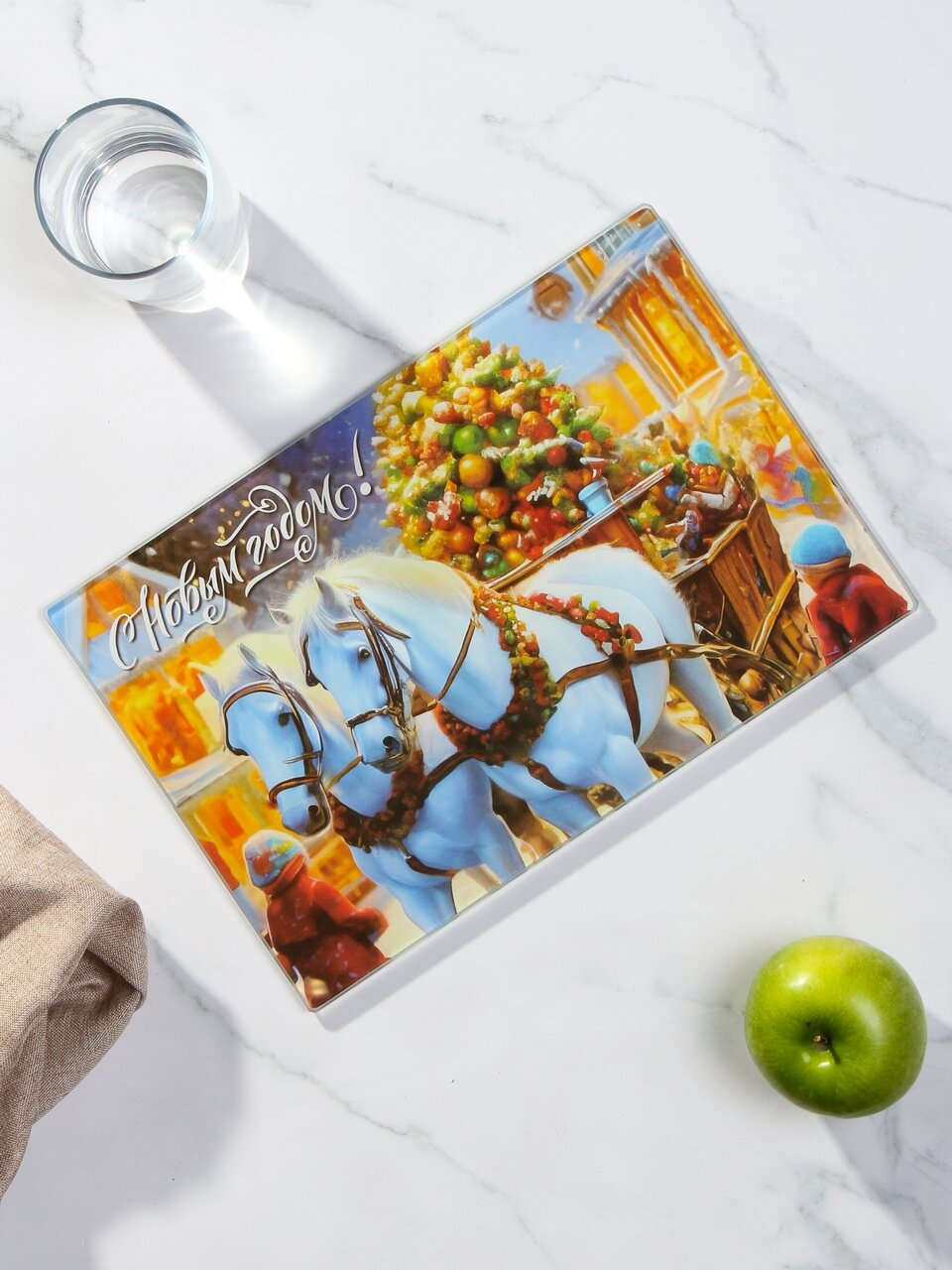 Доска разделочная из стекла 20х30 см с новогодним символом от Daniks — стильный подарок и практичный аксессуар для кухни, который легко мыть и удобно хранить.
