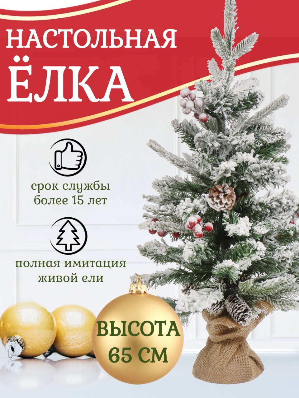 Настольная новогодняя елка 65 см с заснеженными ветками и ягодами — стильный декор для дома или подарка, который не осыпается и не требует ухода.
