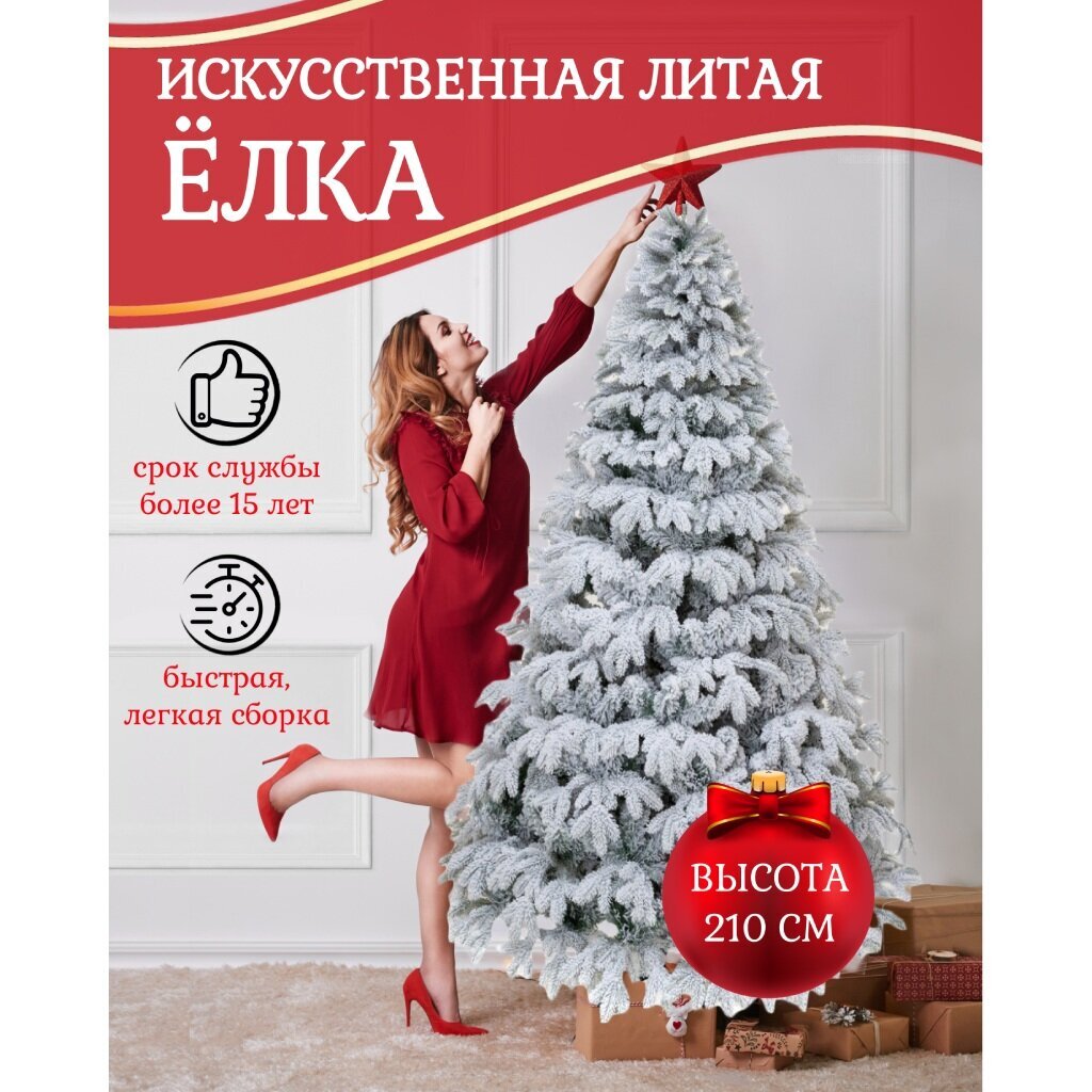 Елка новогодняя напольная 210 см Камчатская с литой заснеженной хвоей — эффектная альтернатива живому дереву для стильного праздника дома или на даче. 792 ветки, диаметр 145 см, металл-подставка, сборка за 15 минут.
