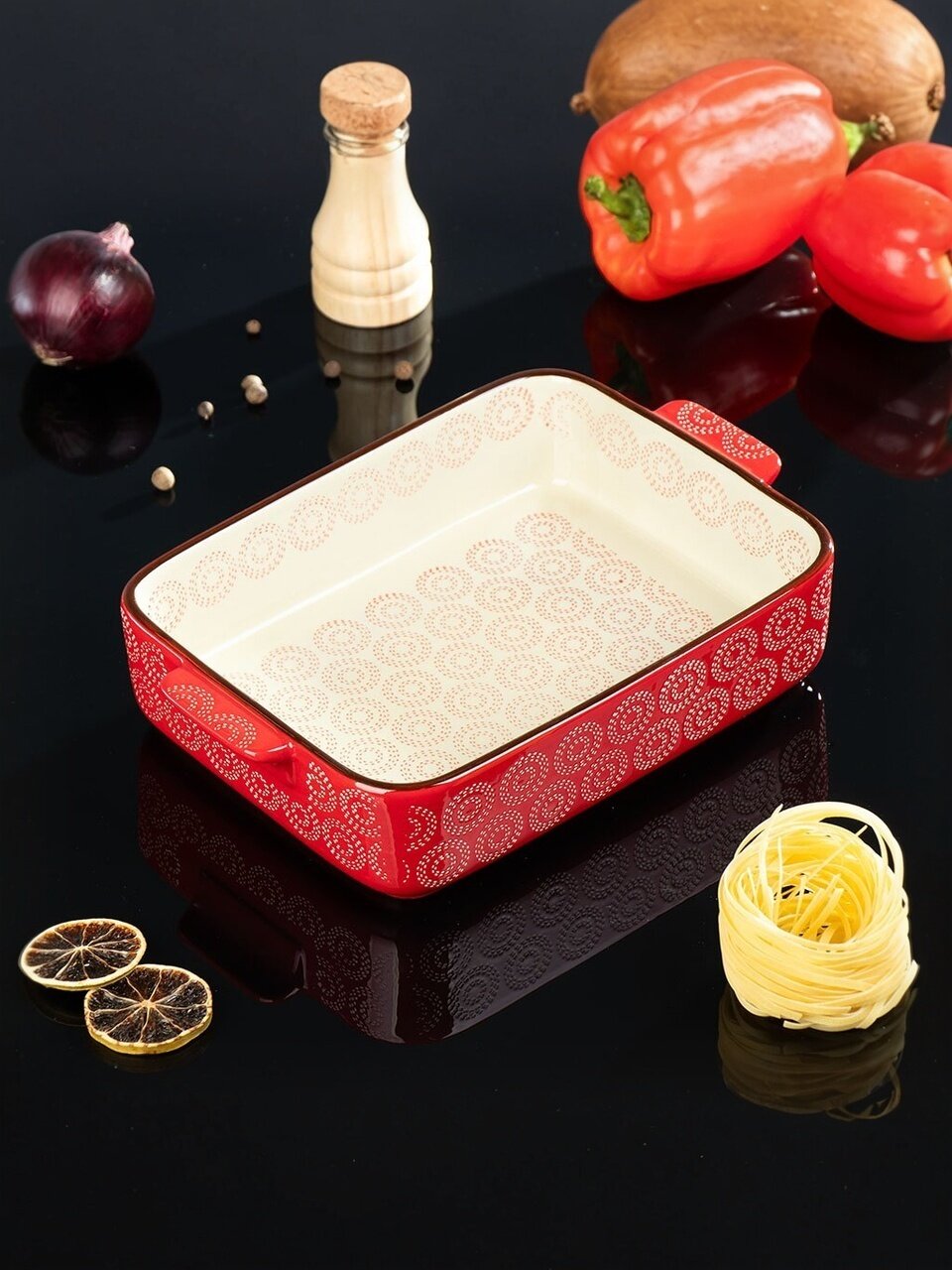 Форма для запекания из керамики 28×18,5×6,5 см «Круги на красном» — стильное решение для вкусной домашней выпечки и запеканок, которое подчеркнёт ваш интерьер и упростит готовку.