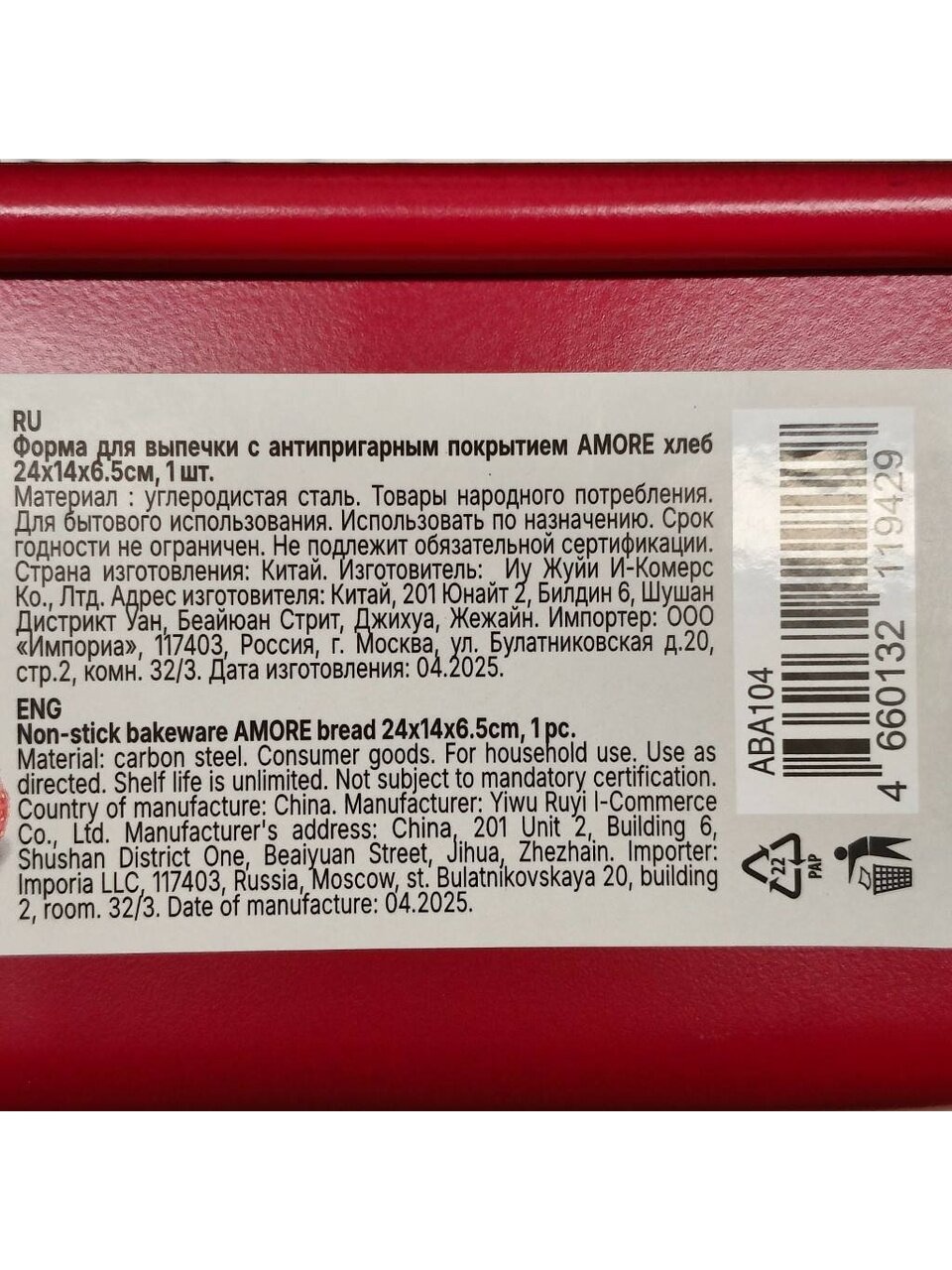 Вы можете приобрести «Форма для выпечки хлеба углеродистая сталь, 14х24х6.5 см, 0.5 л, антипригарное покрытие, прямоугольные, Attribute, Amore, ABA104» и другие товары в нашем интернет-магазине в Серпухове по низким ценам и с бесплатным самовывозом.
