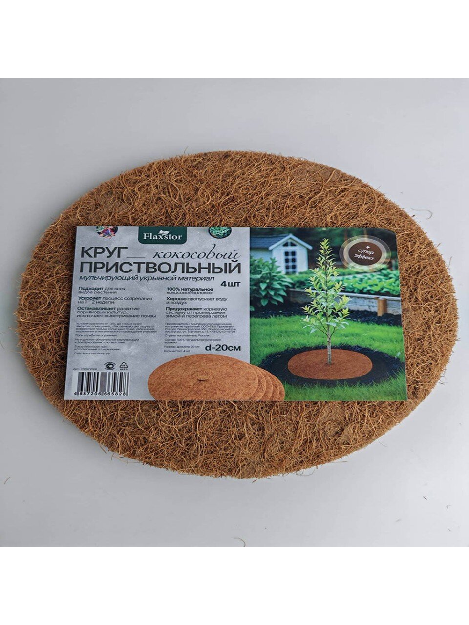 Круги приствольные Flaxstor из кокосового волокна 20 см — натуральная мульча для защиты и питания растений, 4 шт. в упаковке. Увлажнение, чистота и рост урожая без лишних хлопот.