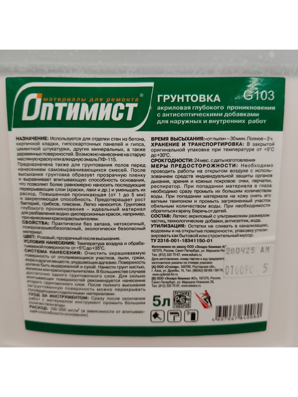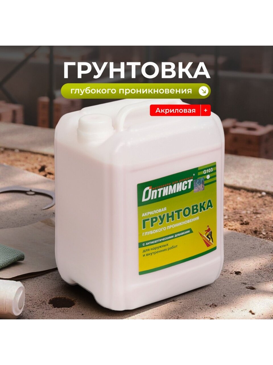 Вы можете приобрести «Грунтовка водно-дисперсионная, акриловая, Оптимист, G103, глубокого проникновения, для внутренних и наружных работ, 10 л, зеленая этикетка» и другие товары в нашем интернет-магазине в Обнинске по низким ценам и с бесплатным самовывозом.