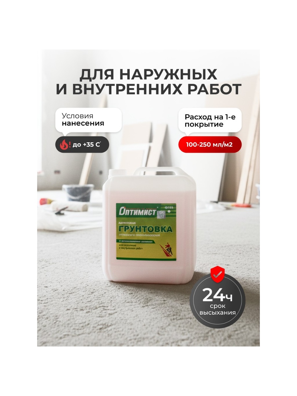 - Условия нанесения: Температура воздуха и обрабатываемой поверхности - от +5°С до +35°С.