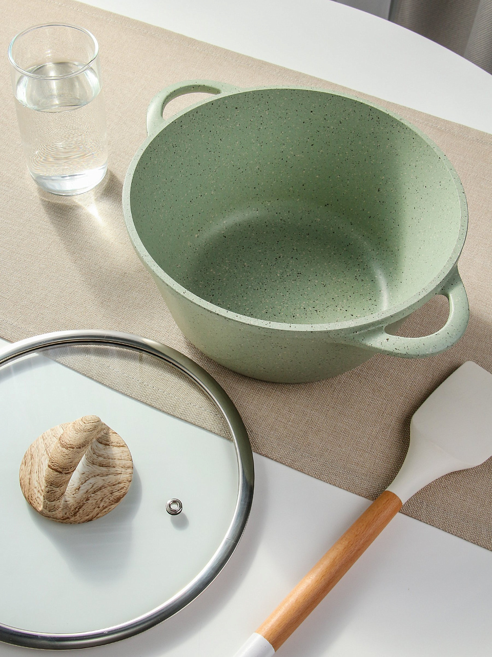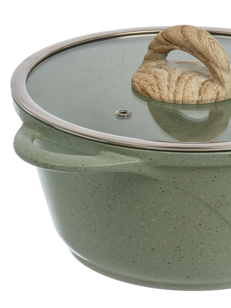 Эта кастрюля с антипригарным покрытием — отличный вариант для тех, кто ищет, какую кастрюлю выбрать для индукционной плиты или как выбрать посуду для ежедневного приготовления супов, гарниров, пельменей. Благодаря толстому дну и алюминиевому корпусу тепло распределяется равномерно, а гранитное покрытие защищает от пригорания даже при минимальном количестве масла. Стеклянная крышка с выпускным клапаном помогает контролировать процесс приготовления, а возможность мытья в посудомоечной машине экономит время.