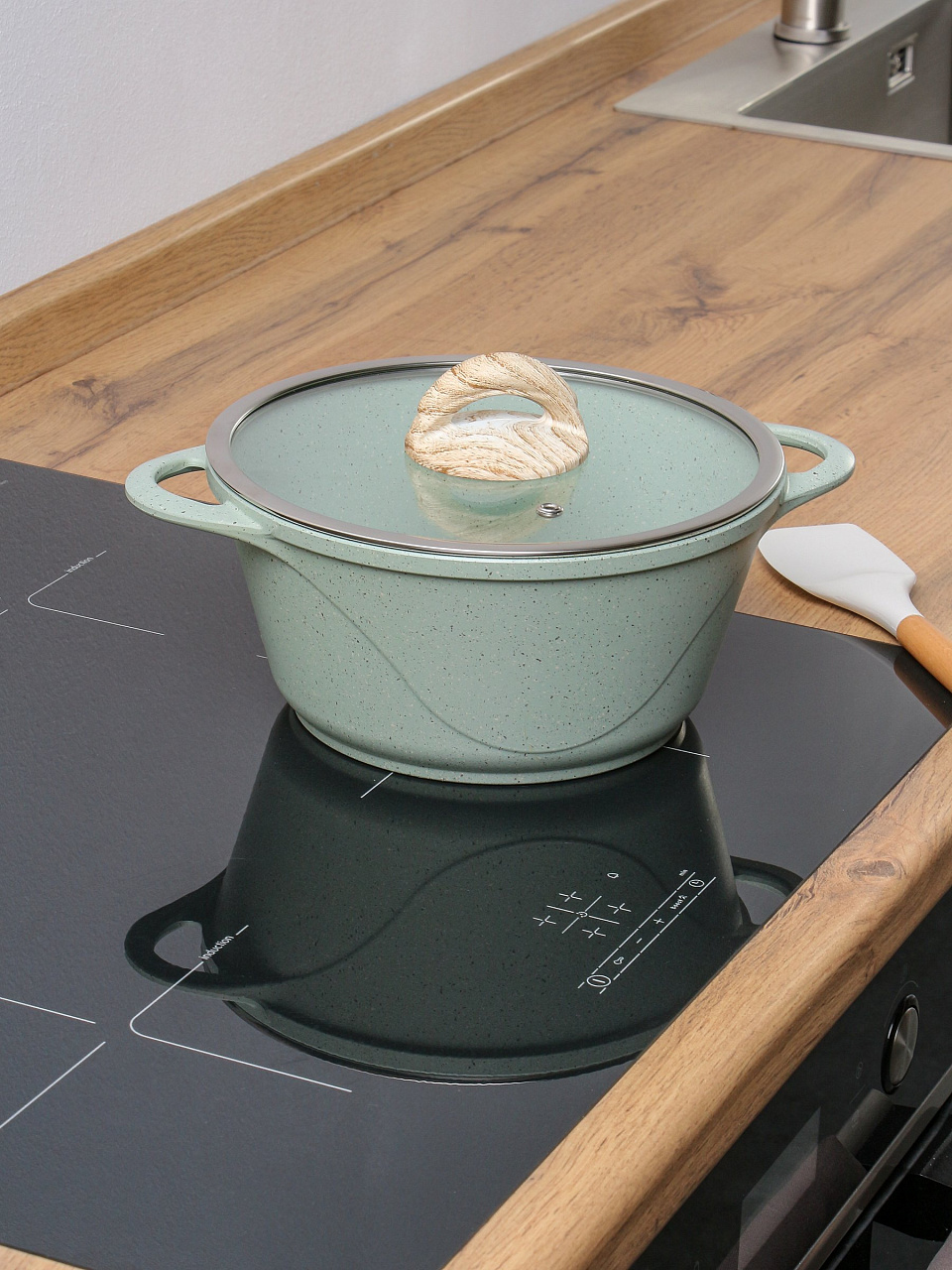 Кастрюля 2 л с антипригарным гранитным покрытием и стеклянной крышкой Гурман Мята — идеальный выбор для индукции, газовых и электрических плит. Готовьте без пригорания и легко мойте!