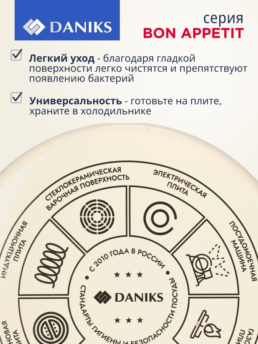 Эта модель легко справляется с приготовлением супов, каш, пюре и других блюд для небольшой семьи. В отличие от посуды с антипригарным покрытием, эмалированная сталь не требует особого ухода и служит дольше. Кастрюля не подходит для посудомоечной машины, что важно учитывать при выборе. Как использовать кастрюлю Daniks Bon Appetit? Просто налейте воду, добавьте ингредиенты и контролируйте процесс через прозрачную крышку — всё под контролем!