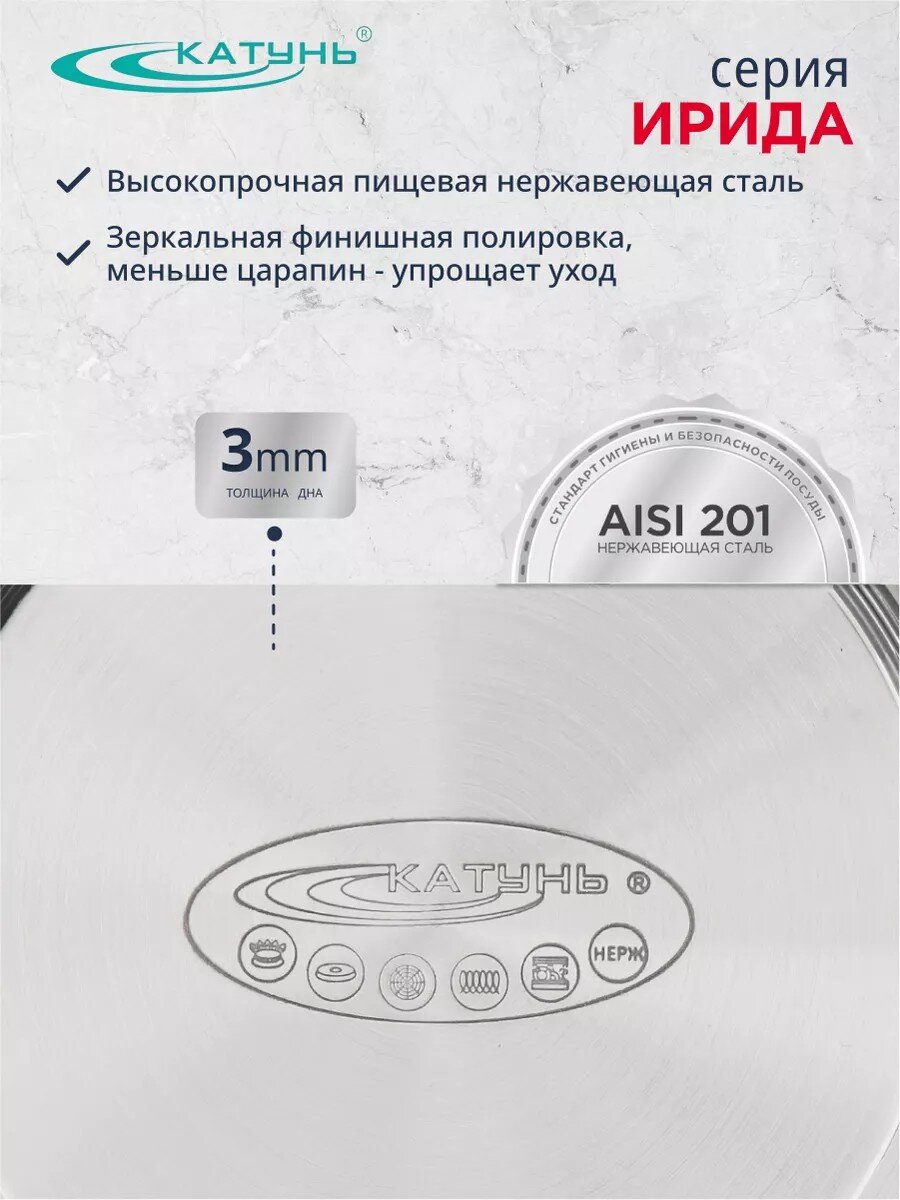 Преимущества покупки: гарантия 12 месяцев от производителя, возможность мытья в посудомойке, современный серебристый дизайн. Закажите кастрюлю Катунь Ирида сейчас и оцените удобство приготовления на любой плите — выгодно, быстро, с доставкой!