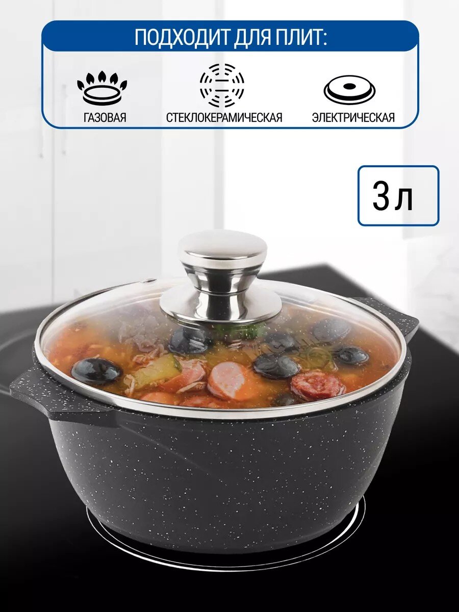 Кастрюля 3 л Мечта Гранит black — универсальная посуда с антипригарным гранитным покрытием для здорового питания и быстрой готовки дома и на даче.