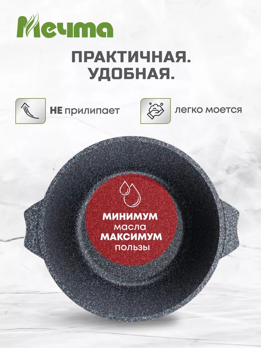 Кастрюля Мечта Гранит star Induction — это современное решение для тех, кто ищет, какую кастрюлю выбрать для индукционной плиты или хочет купить недорого кастрюлю с антипригарным покрытием для дома и дачи. Благодаря толстому дну (6 мм) и гранитному покрытию пища не пригорает, а тепло распределяется равномерно. Легкий алюминиевый корпус (вес 1,05 кг) облегчает использование и мытье, в том числе в посудомоечной машине. Стеклянная крышка с выпускным клапаном позволяет контролировать процесс приготовления и сохраняет сочность блюд.