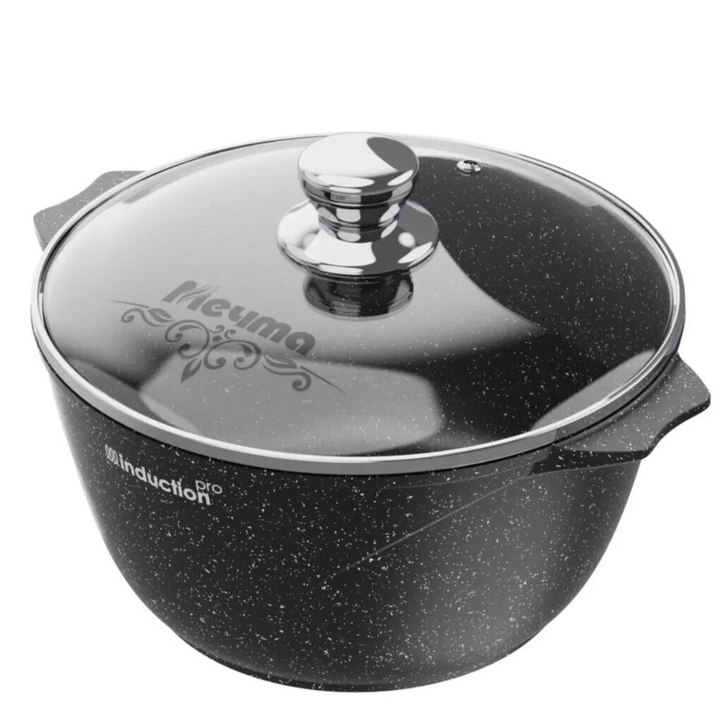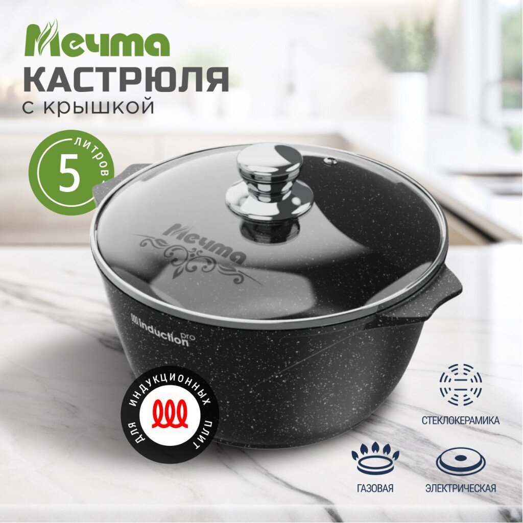 Кастрюля 5 л Мечта Гранит Black Induction Pro — антипригарная алюминиевая посуда с крышкой из закалённого стекла для индукционных и всех типов плит. Готовьте легко и без пригорания!