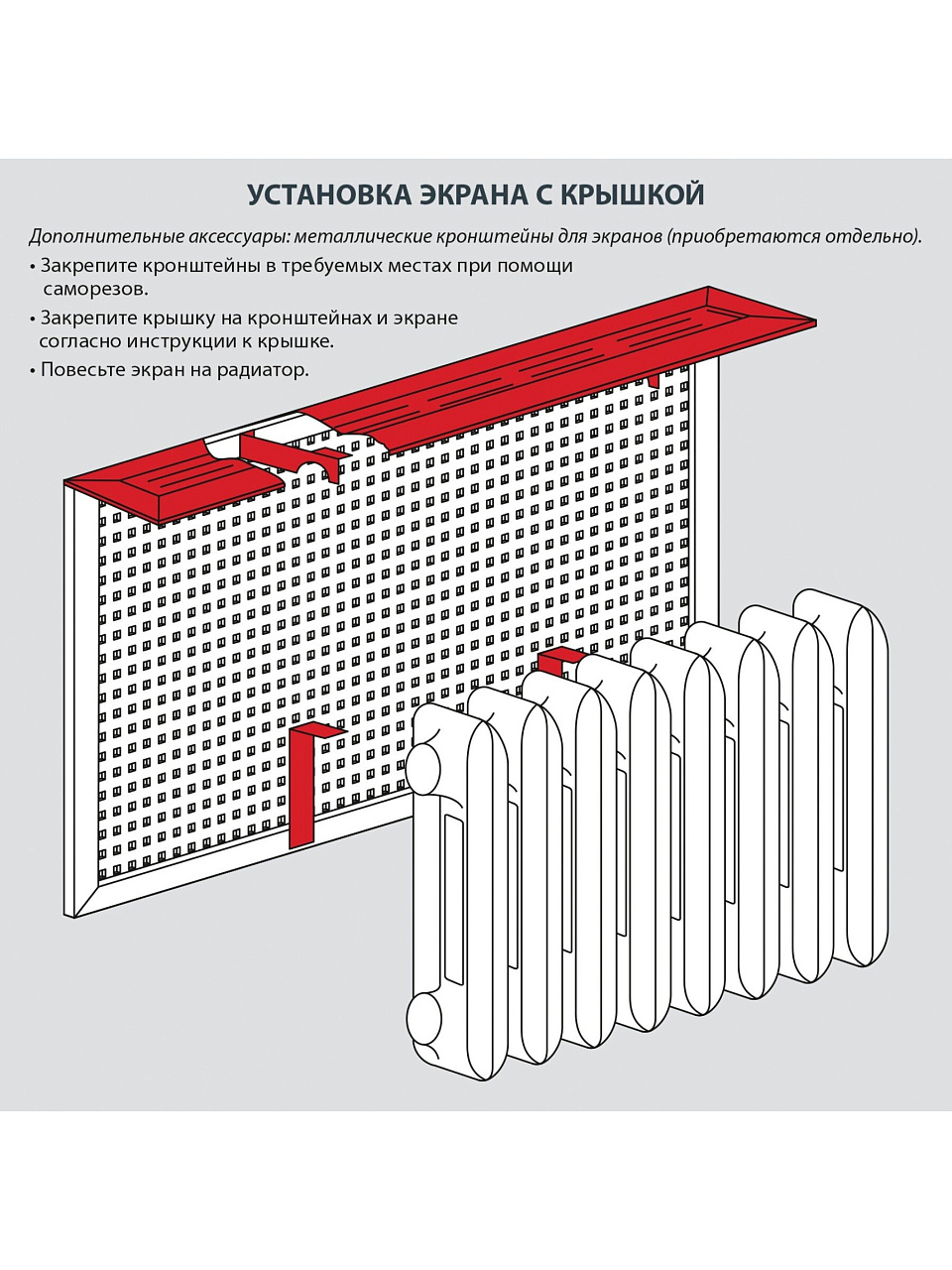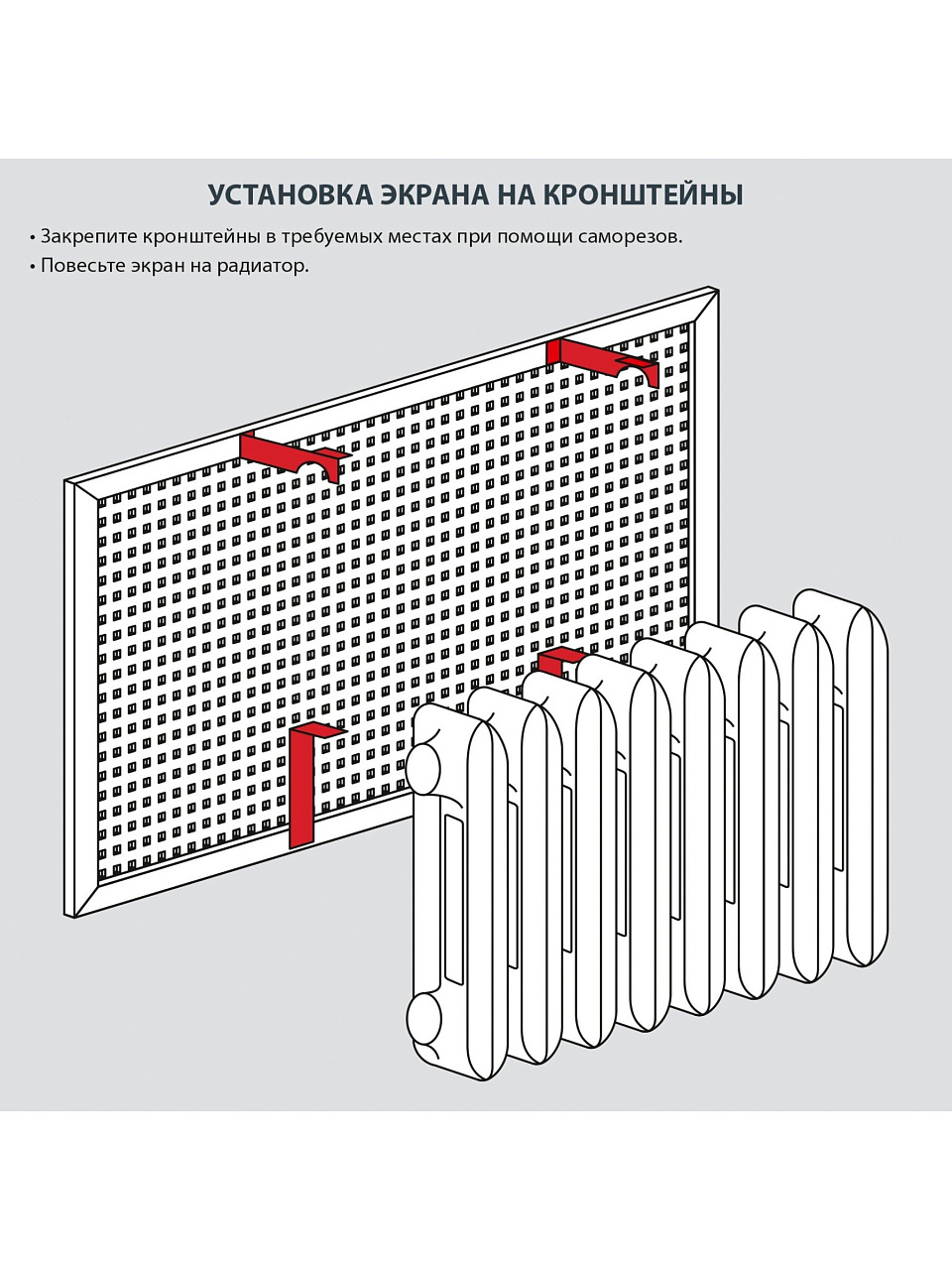 Изделия применяются в системах отопления, теплоносителем в которых является вода или жидкие среды, неагрессивные к материалам изделия, а также в системах с низкозамерзающим теплоносителем. Кронштейн предназначен для установки декоративного экрана на чугунные, алюминиевые, биметаллические радиаторы отопления.