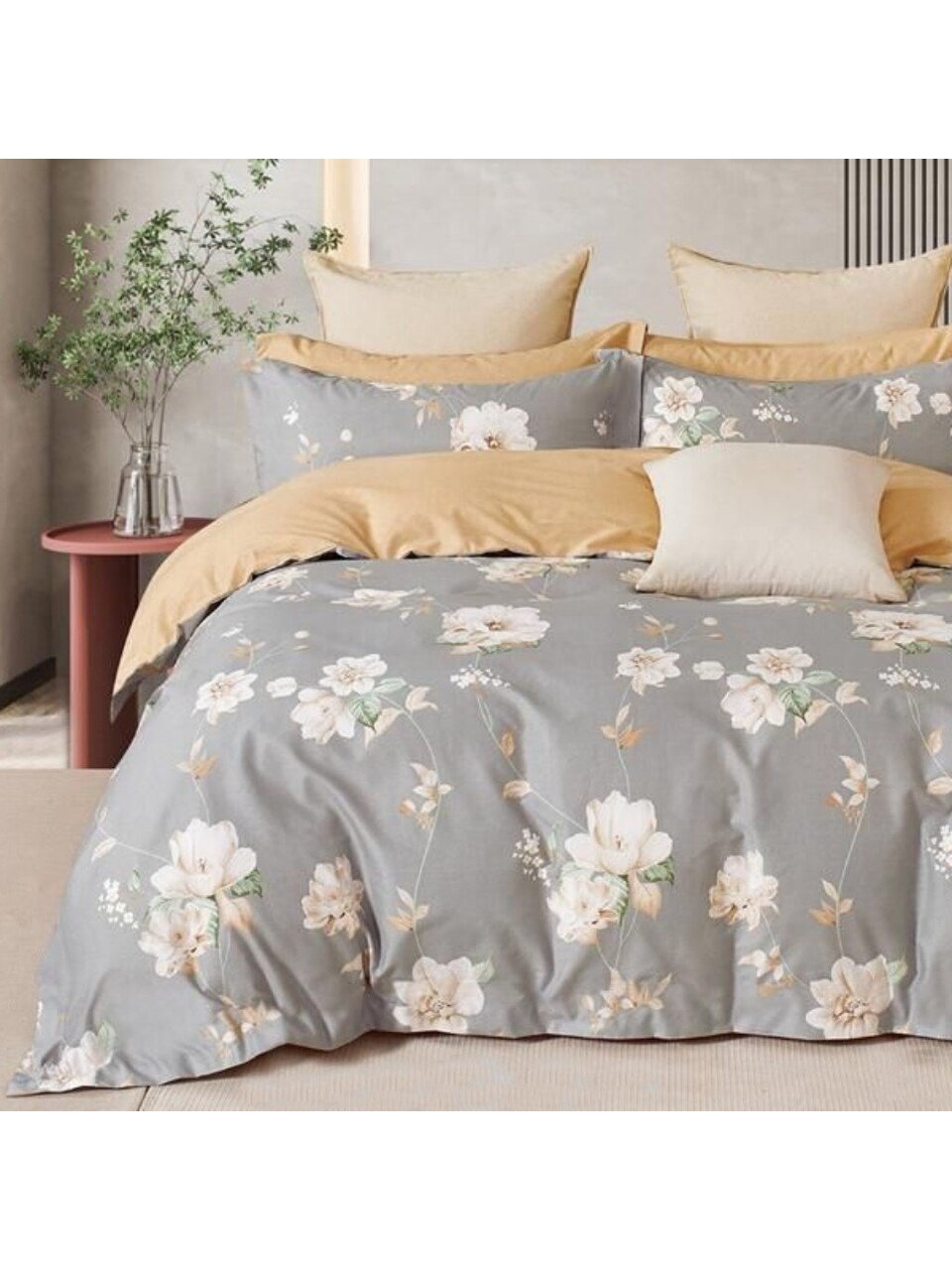 Семейный комплект постельного белья CL Home Pure Cotton: 7 предметов из поплина, 100% хлопок, серый с цветами — комфорт для двоих, гармония и долговечность.