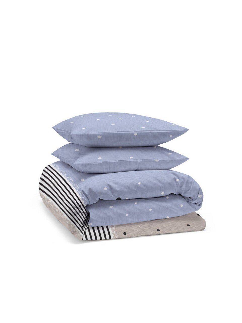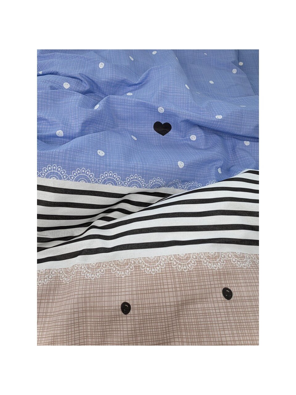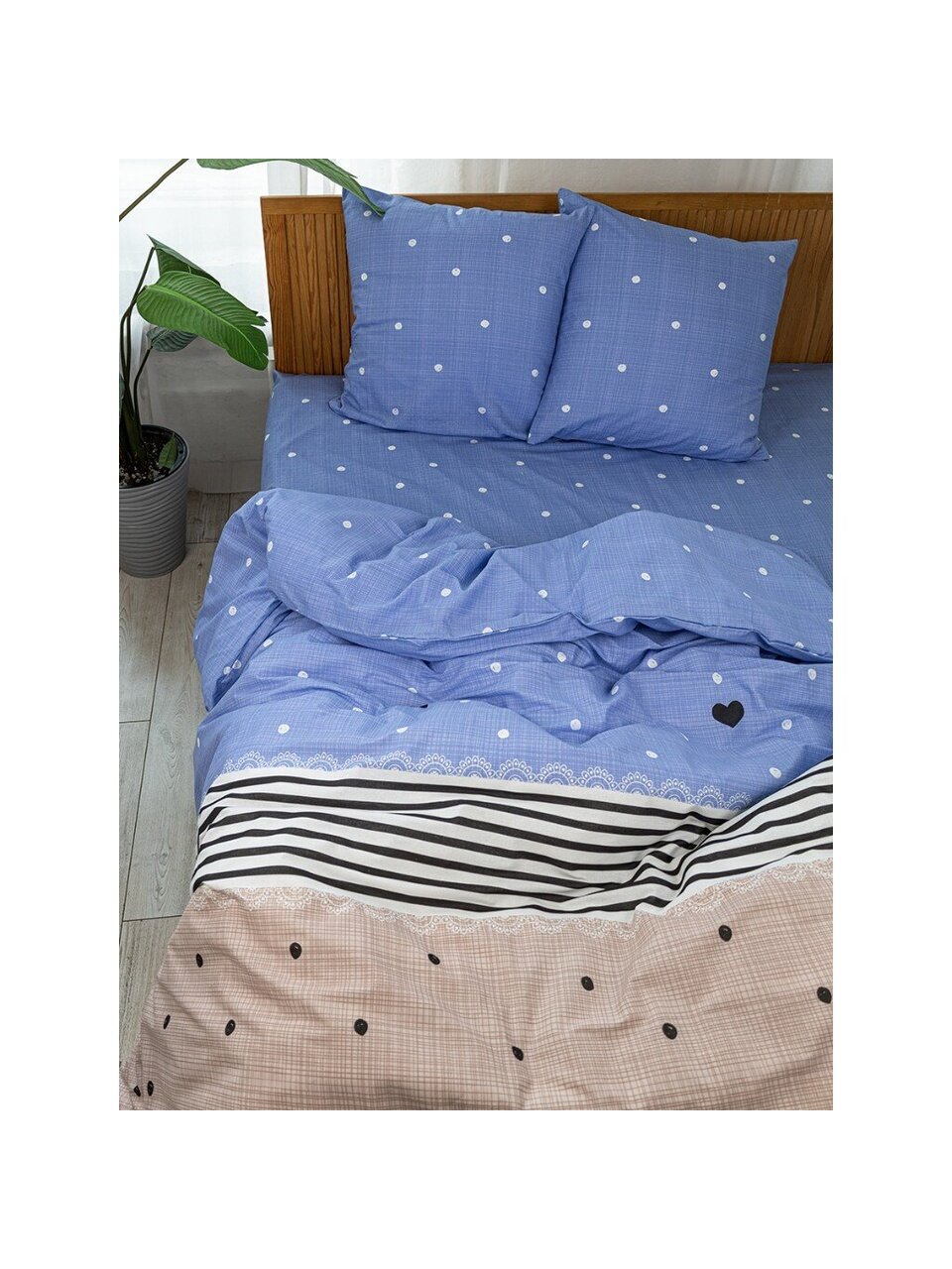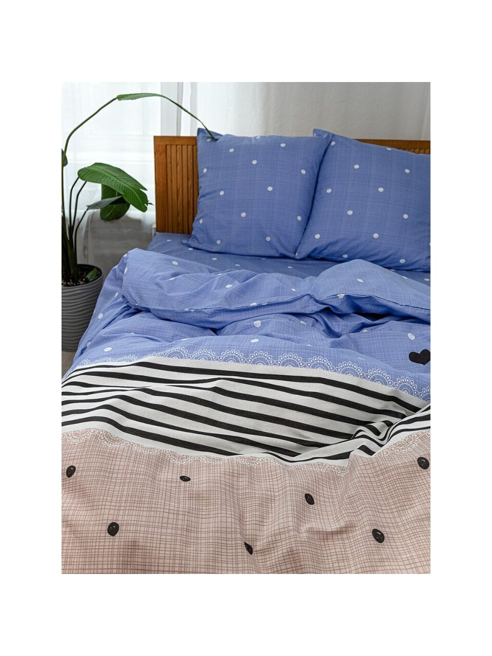 - Универсальные размеры: простыня 150х215 см, пододеяльник 145х215 см, 2 наволочки 70х70 — подходят для стандартных кроватей