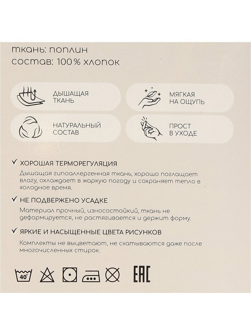 Комплект выполнен из 100% хлопкового поплина, плотность 110 г/м2, рекомендуется машинная стирка при 40°C для сохранения цвета и текстуры ткани.