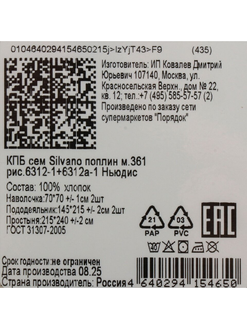 Вы можете приобрести «Постельное белье семейное, простыня 215х240 см, 2 наволочки 70х70 см, 2 пододеяльника 145х215 см, Silvano, поплин, Ньюдис» и другие товары в нашем интернет-магазине в Брянске по низким ценам и с бесплатным самовывозом.