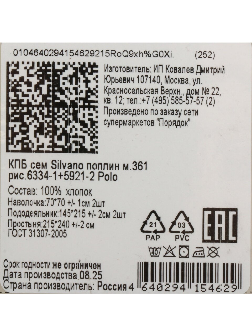 Вы можете приобрести «Постельное белье семейное, простыня 215х240 см, 2 наволочки 70х70 см, 2 пододеяльника 145х215 см, Silvano, поплин, Polo» и другие товары в нашем интернет-магазине в Краснодаре по низким ценам и с бесплатным самовывозом.