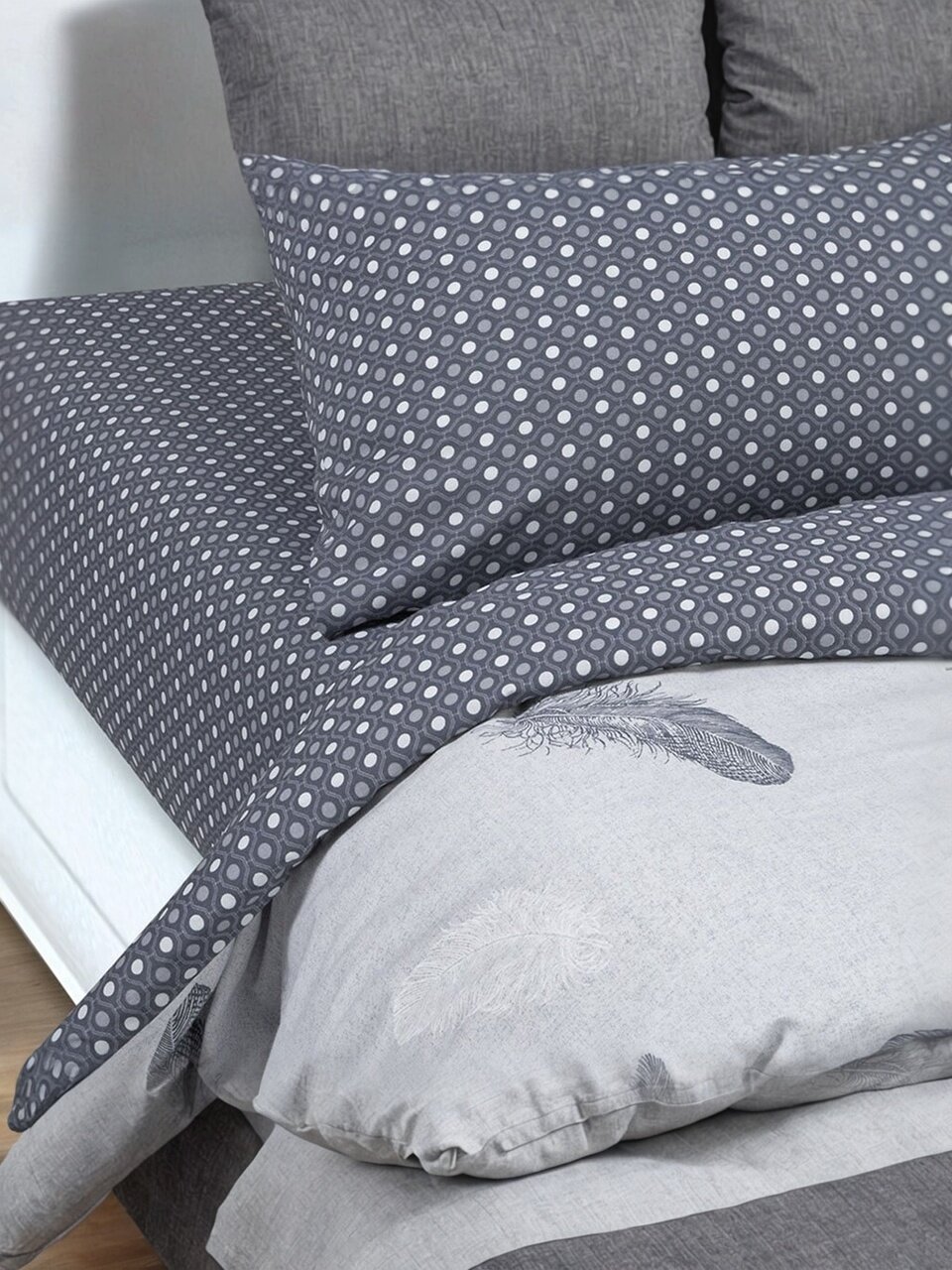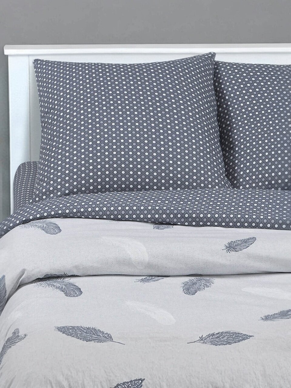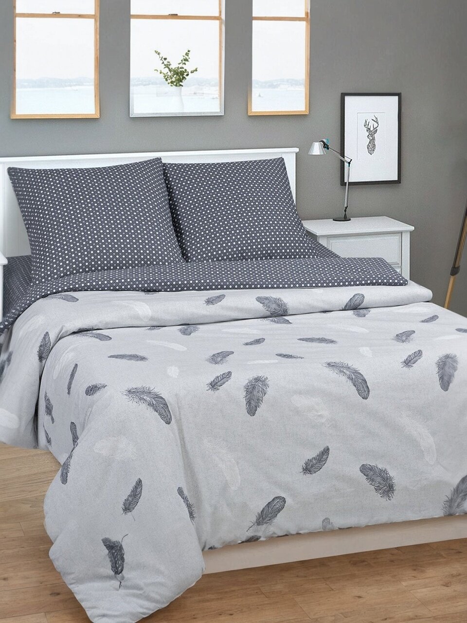 Многие спрашивают: чем отличается поплин от сатина или бязи? Поплин плотнее и износостойче, при этом остается дышащим и приятным на ощупь. Белье легко стирать при 40 градусах — оно не садится и не теряет цвет. Серый цвет с узором «перья» впишется в любой интерьер, а подарочная упаковка делает комплект отличным вариантом для подарка на новоселье или свадьбу.