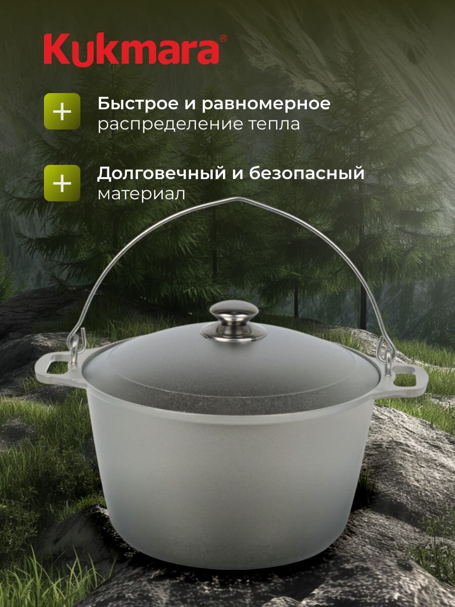 Походный котелок Kukmara из литого алюминия хорошо подходит для варки, тушения и томления, так как имеет отличные теплораспределительные и теплоаккумулирующие свойства, а блюда в нем получаются сочными и ароматными.
