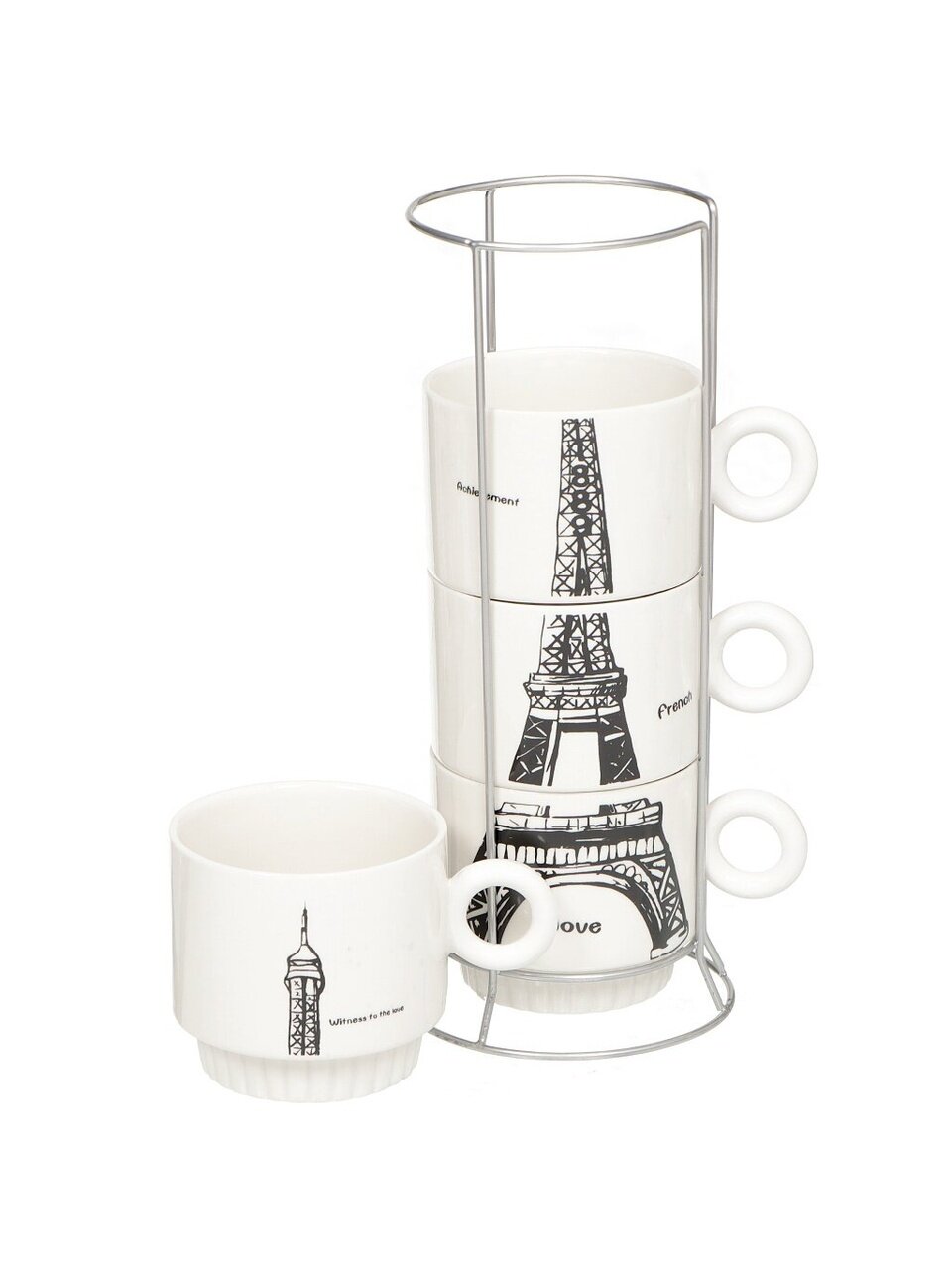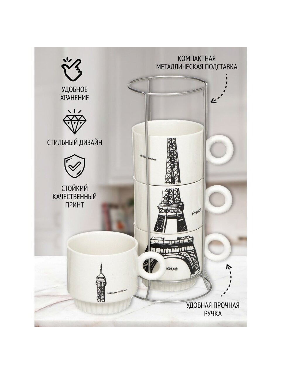 Набор керамических кружек 220 мл с дизайном «Эйфелева башня» (4 шт) и металлической подставкой — стиль для дома, удобство для подарка, практично для кухни.
