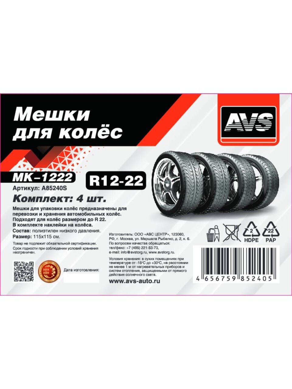 Мешки для колес 115х115 см, 4 шт, R22, AVS, MK-1222, A85240S — отличное решение для хранения и транспортировки автомобильных колес. Защита от пыли, грязи и влаги обеспечивает чистоту в гараже и доме, а прочный материал гарантирует надежность использования. Идеальный выбор для сезонного хранения шин и поддержания порядка.