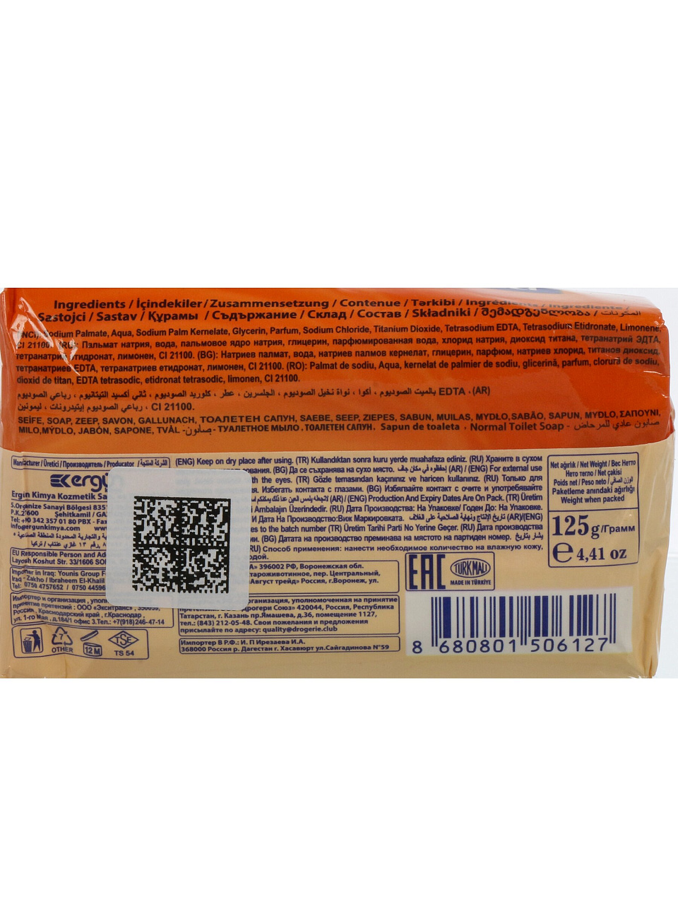Мыло изготовлено на натуральной основе с добавлением ароматизатора дыни, вес — 125 г, не содержит агрессивных химикатов, подходит для всех типов кожи.