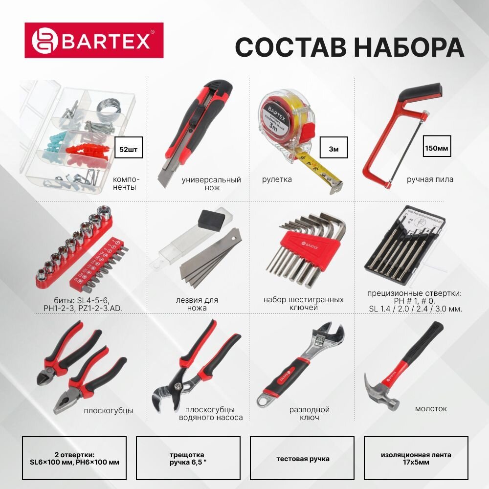 Набор слесарных инструментов Bartex позволяет выполнить широкий спектр задач и ремонтных работ, не требуя покупки отдельных инструментов для каждой конкретной задачи. Это экономит время и деньги, делая набор универсальным и удобным для использования.
