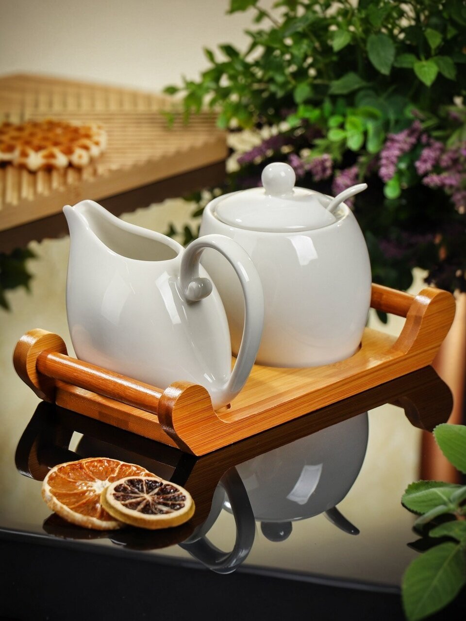 Набор из сахарницы и молочника выполнен из керамики. Классическое цветовое решение и удобство использования делают этот набор желанным подарком для любой хозяйки.