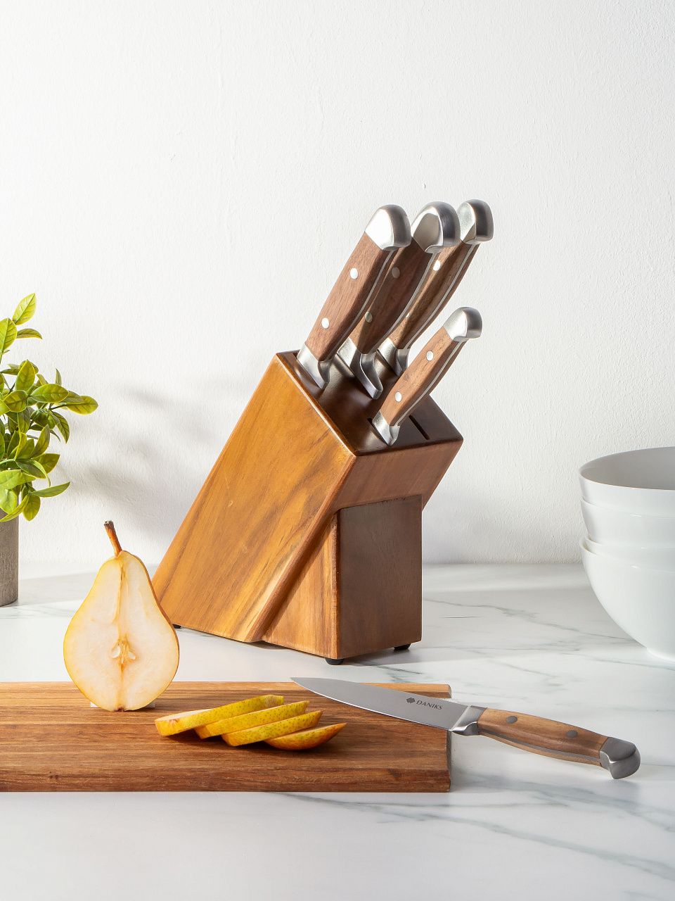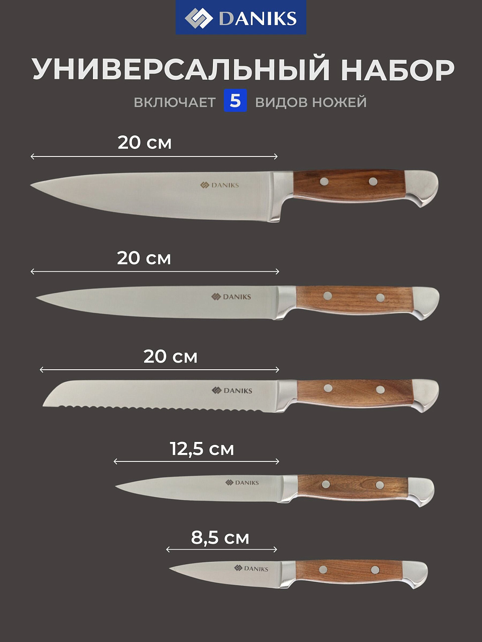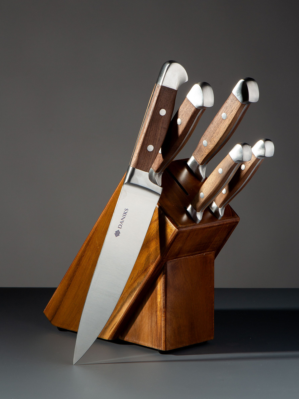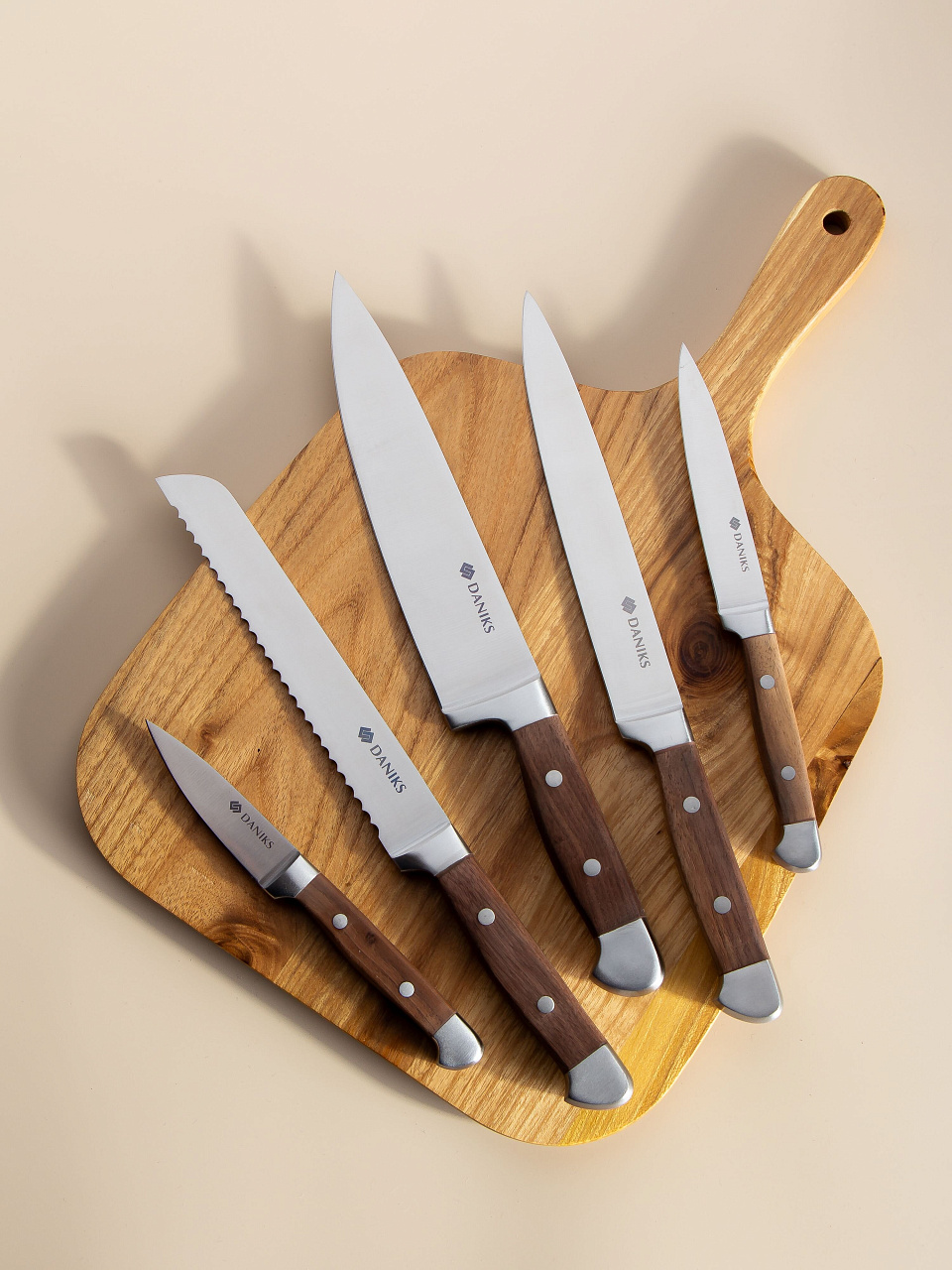 Комплектация набора позволяет с легкостью справляться с любыми кулинарными задачами: от нарезки хлеба до филигранной шинковки овощей и мяса. Стильная подставка обеспечивает компактное хранение, защищая ножи и поддерживая порядок на кухне. Благодаря эргономичной форме и оптимальному балансу ножи Daniks удобно лежат в руке, обеспечивая безопасность и контроль во время работы. Стильный коричневый цвет подставки гармонирует с любым интерьером кухни, а цельнометаллическая конструкция ручек подчеркивает надежность и прочность изделия.
