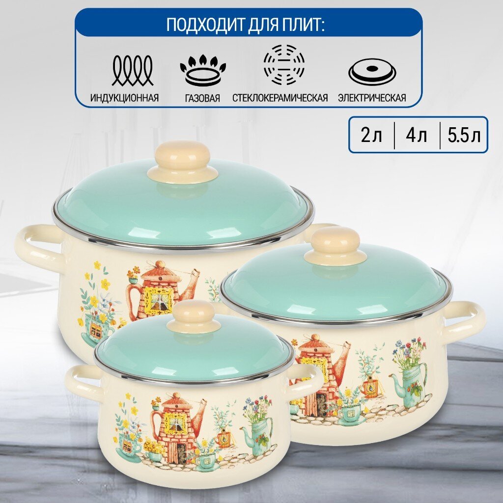 Вы можете приобрести «Набор посуды эмалированная сталь, 3 предмета, 2, 4, 5.5 л, индукция, СтальЭмаль, Чайный домик, 1с408» и другие товары в нашем интернет-магазине в Курске по низким ценам и с бесплатным самовывозом.