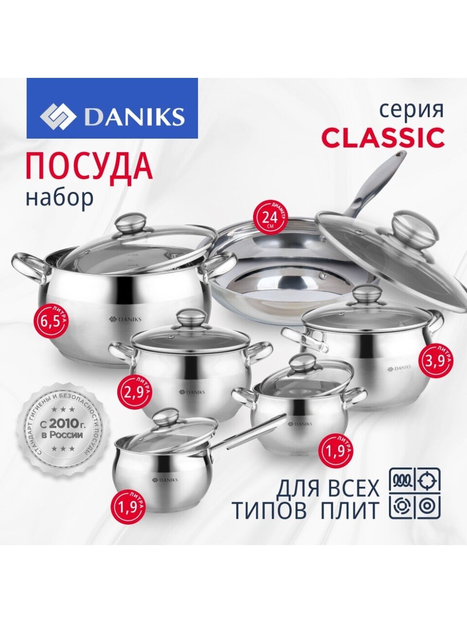 В наборе: кастрюли 1.9, 2.9, 3.9, 6.5 л, ковш 1.9 л, сковорода 24 см, стеклянные крышки с клапаном. Всего 12 предметов, включая крышки.