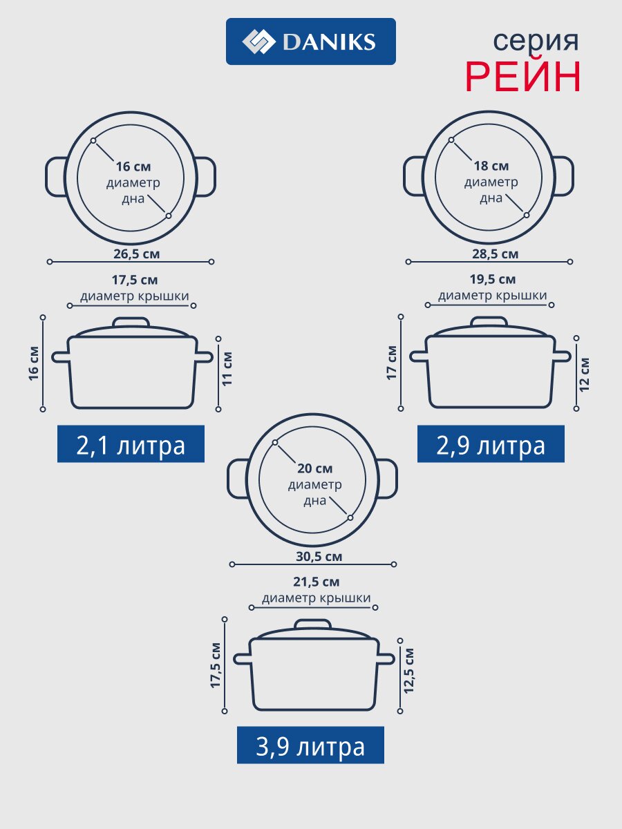 - Универсальность: три кастрюли (2.1, 2.9, 3.9 л) подходят для всех типов плит, включая индукцию