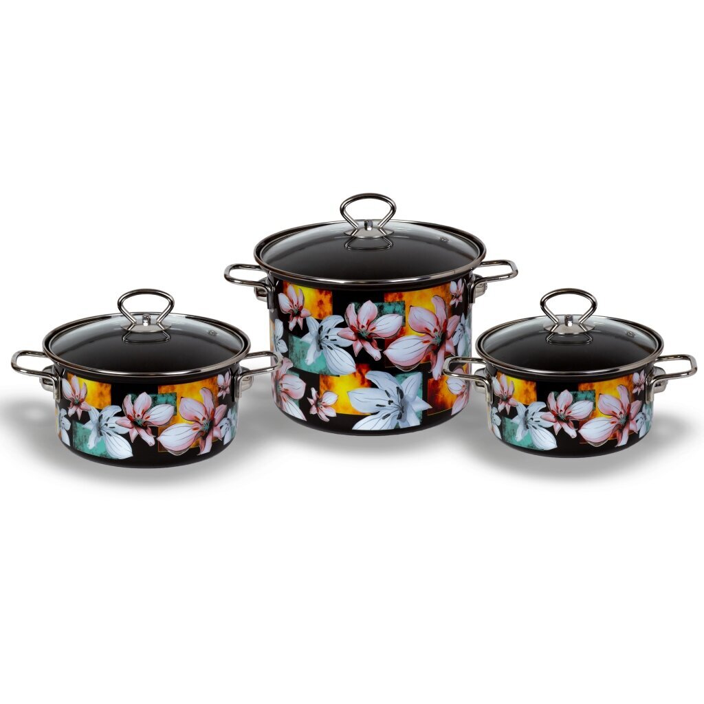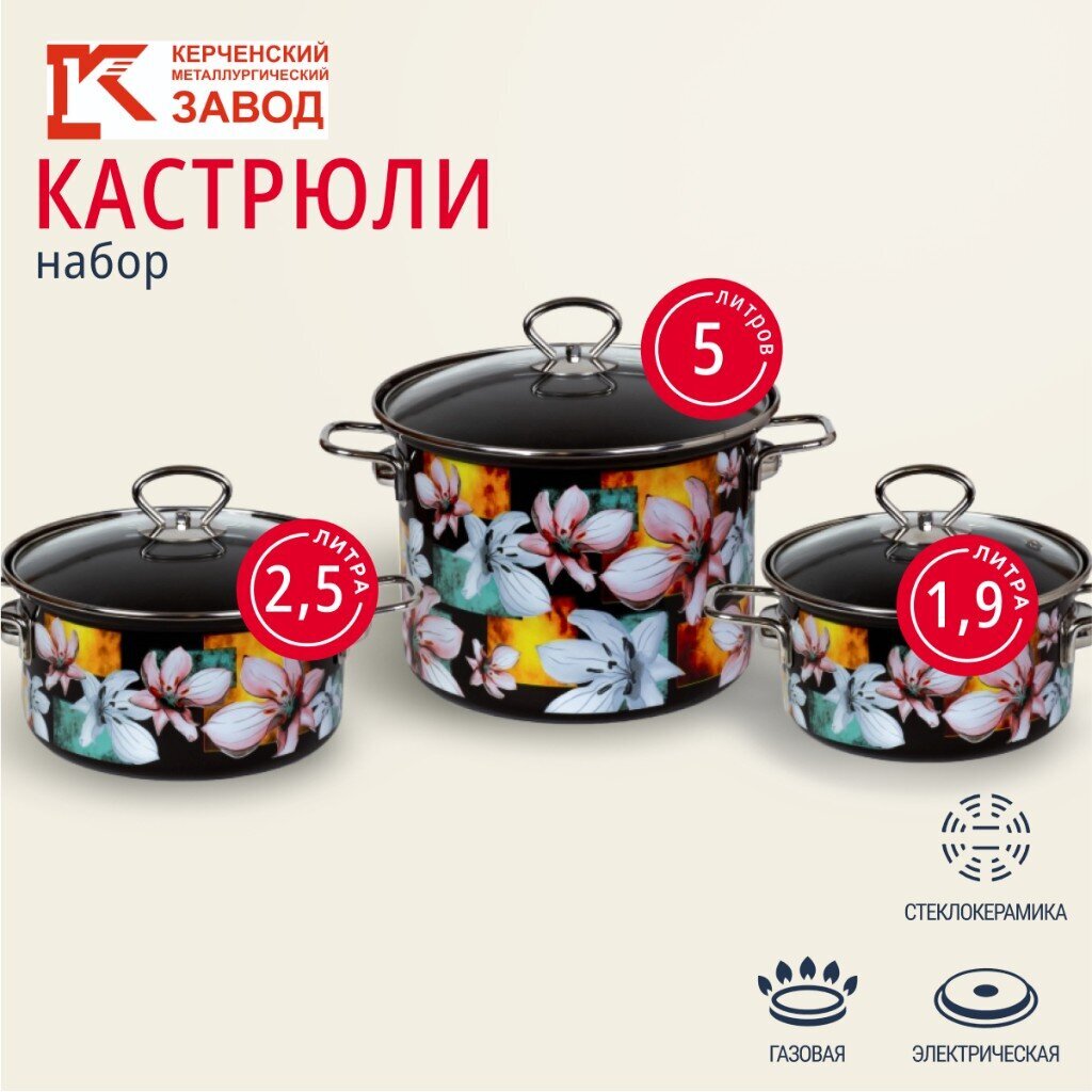 Состав набора: кастрюля с крышкой 1,9 л, кастрюля с крышкой 2,5 л, кастрюля с крышкой 5 л.