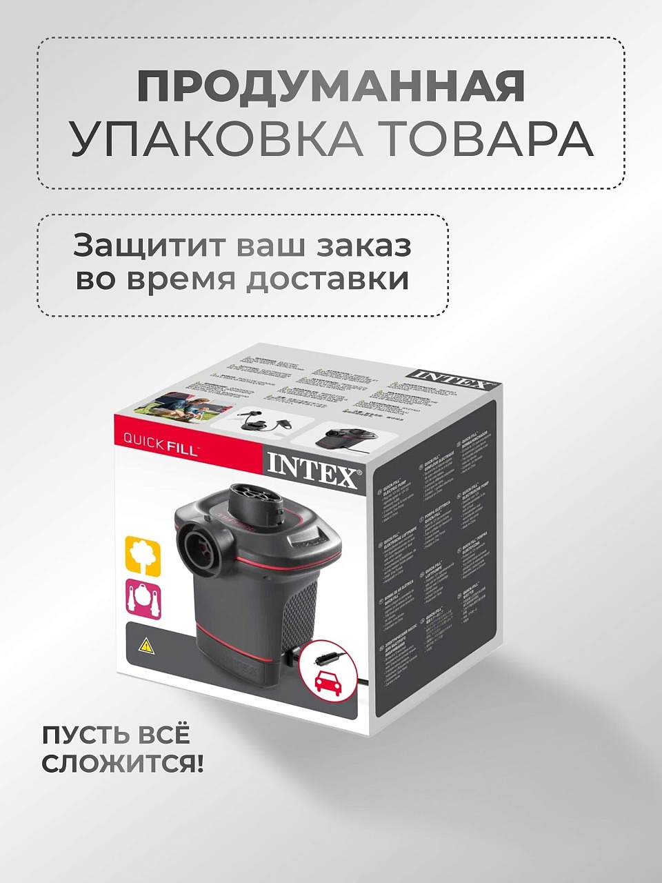 Насос электрический QUICK-FILL представляет собой электронасос, который работает от сети бортового питания автомобиля. С помощью этого насоса можно как накачивать изделия, так и сдувать их. Электрические насосы фирмы Intex изготавливаются из легкого ударопрочного пластика. В комплекте с насосом идет провод к прикуривателю 12в и три универсальных насадки для всех видов надувных изделий.