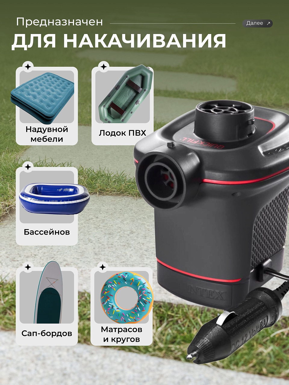 Насос подходит ко всем надувным изделиям INTEX(кровати, матрасы, бассейны, лодки, плавательные принадлежности, игровые центры).