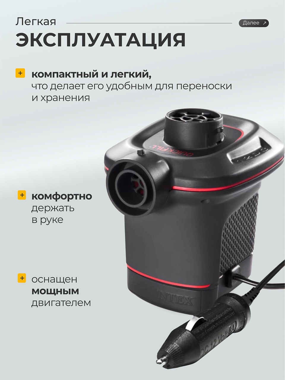 Вы можете приобрести «Насос воздушный электрический, 12 В, 3 насадки, + прикуриватель, Intex, 66636» и другие товары в нашем интернет-магазине в Железногорске по низким ценам и с бесплатным самовывозом.