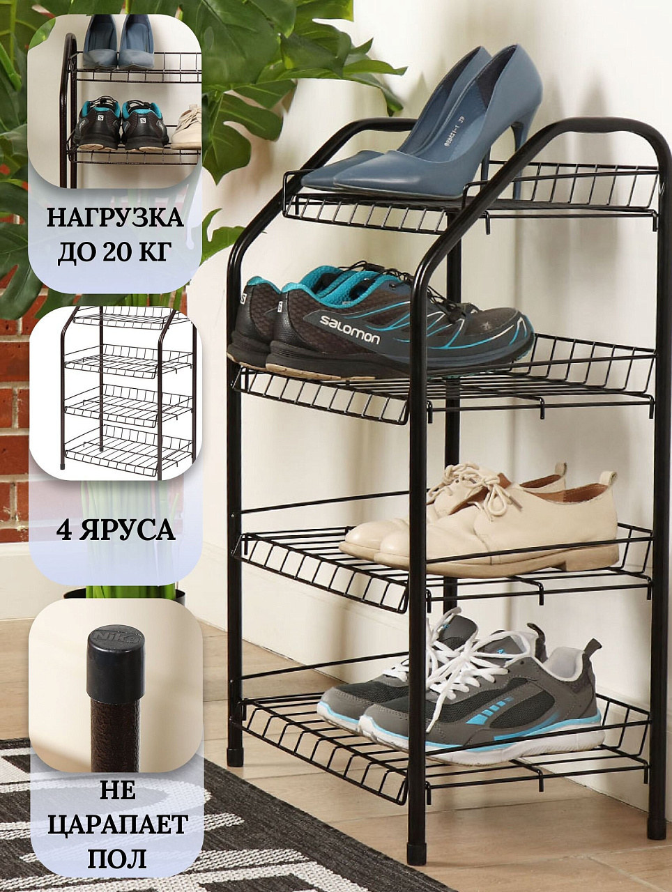 Этажерка для обуви Nika применяется для установки в квартирах, частных домах, а также общественных раздевалках. Конструкция выполнена из стали в сочетании с пластиком, отличается прочностью и долговечностью.