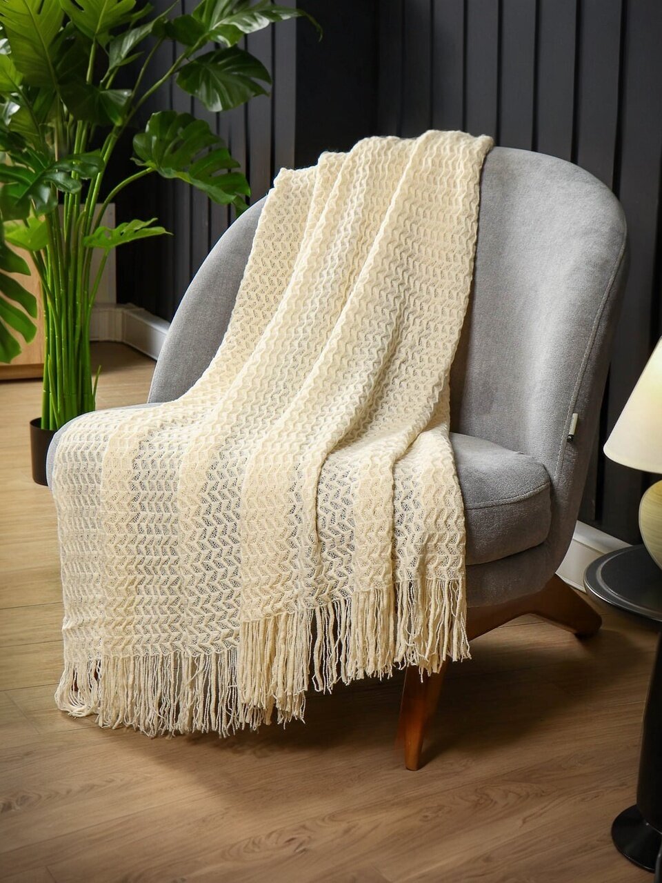 - Эксклюзивный вязаный дизайн с модным зигзагообразным орнаментом и бахромой — стильное решение для любого интерьера