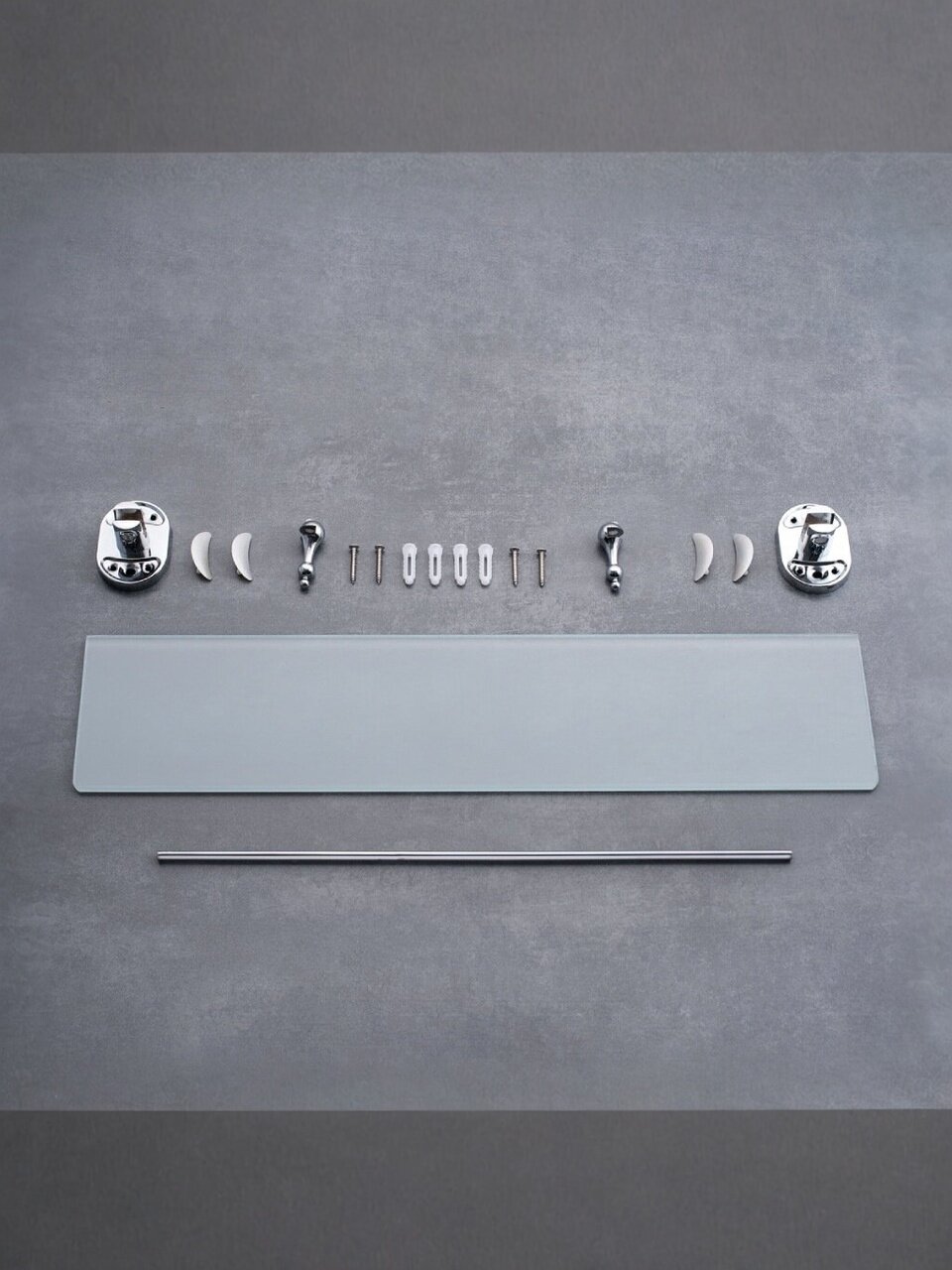Полная комплектация: держатель(диаметр 5 см), полка стеклянная, набор для монтажа;