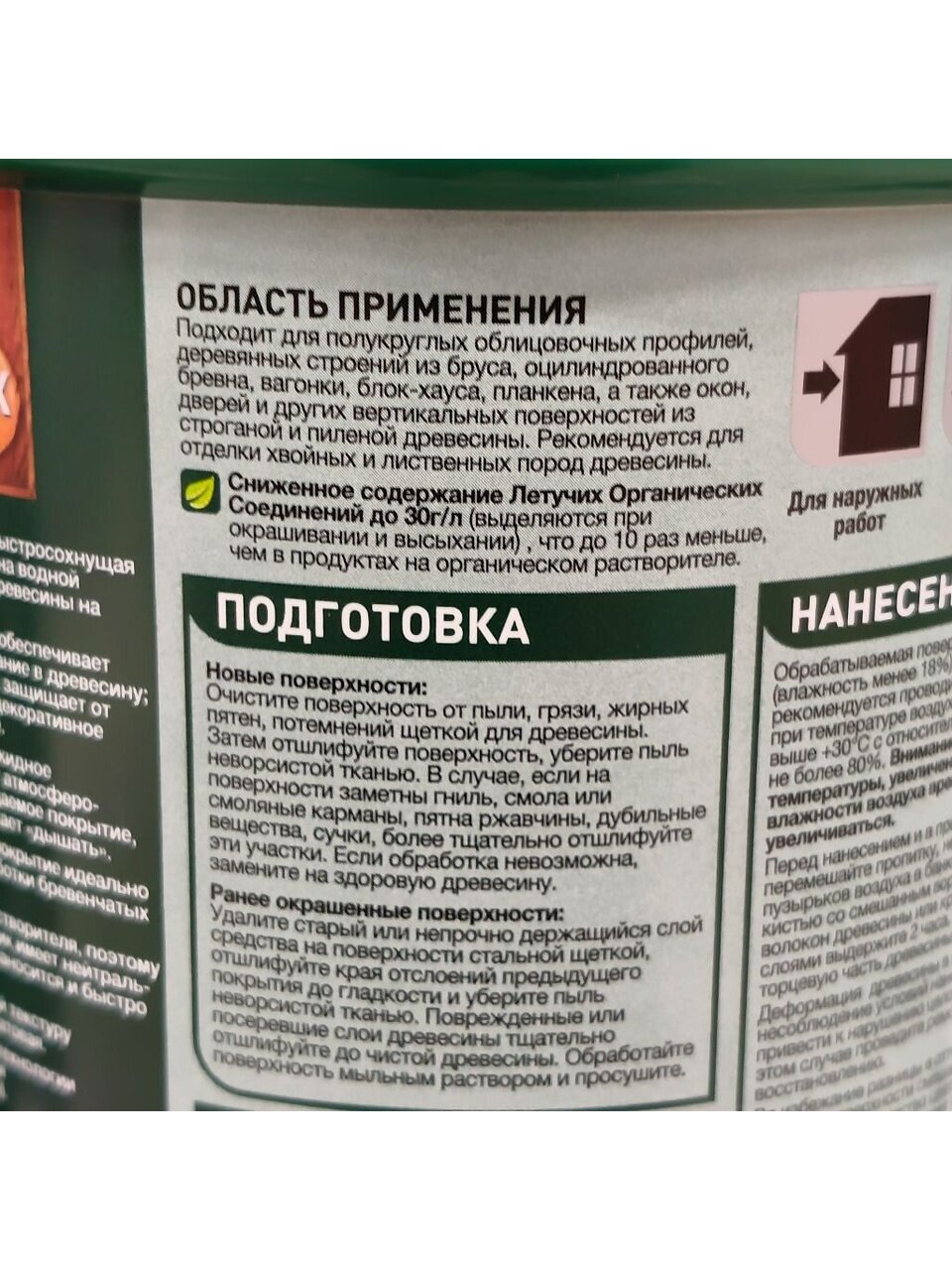 Быстросохнущая пропитка-антисептик на гибридной основе для защиты древесины. Эластичное тонкое покрытие идеально подходит для обработки бревенчатых фасадов и бань.
