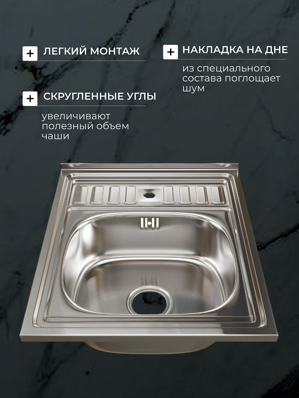 Размер мойки — 500х600 мм (50х60 см). Она подходит для большинства стандартных кухонных тумб шириной от 60 см, что делает установку быстрой и удобной.