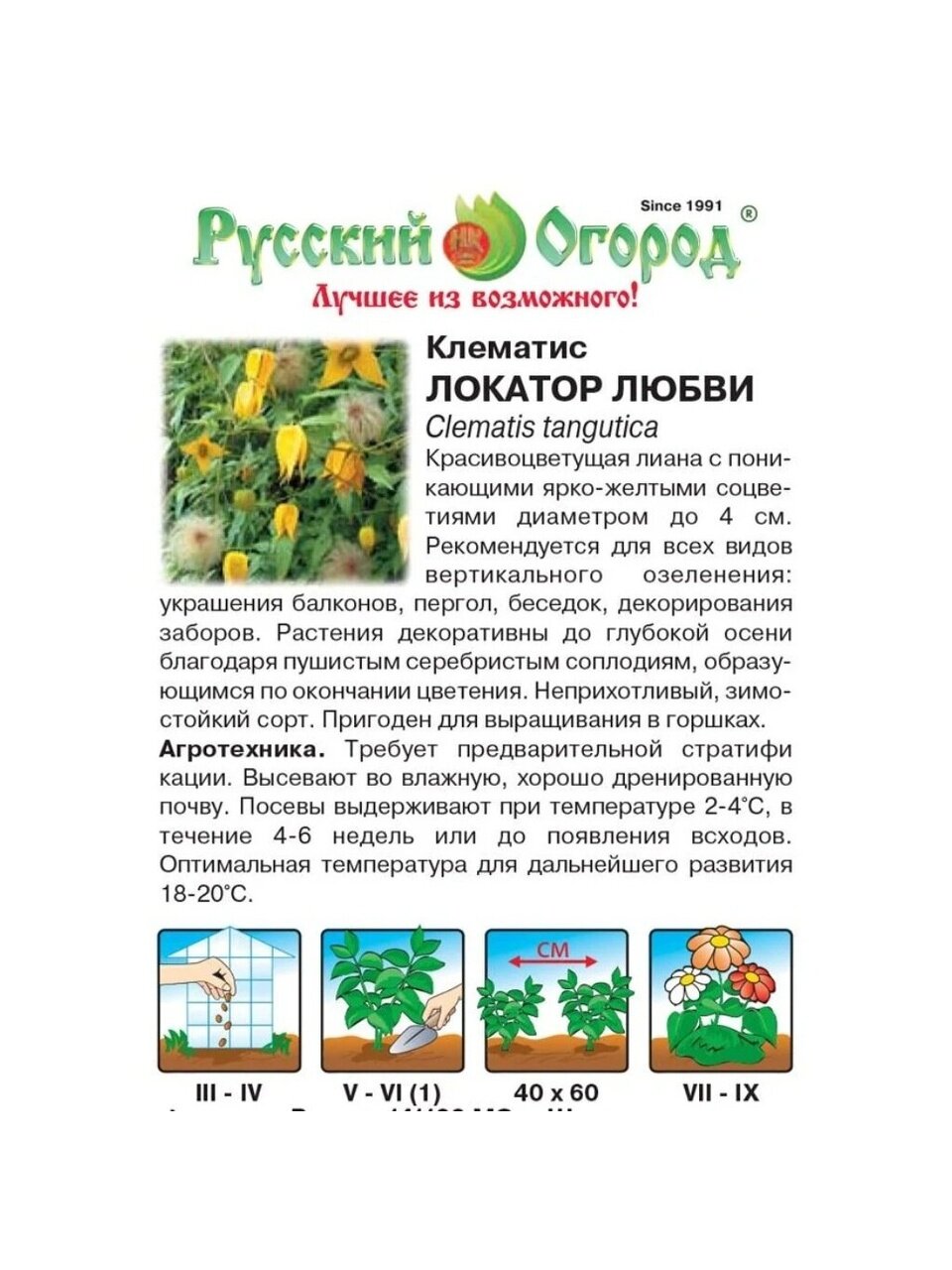 Подарите саду нотки романтики и изысканности с семенами цветов "Клематис, Локатор любви" от бренда "Русский огород". Этот многолетний цветок станет настоящим украшением любого сада и подчеркнет вашу индивидуальность.
