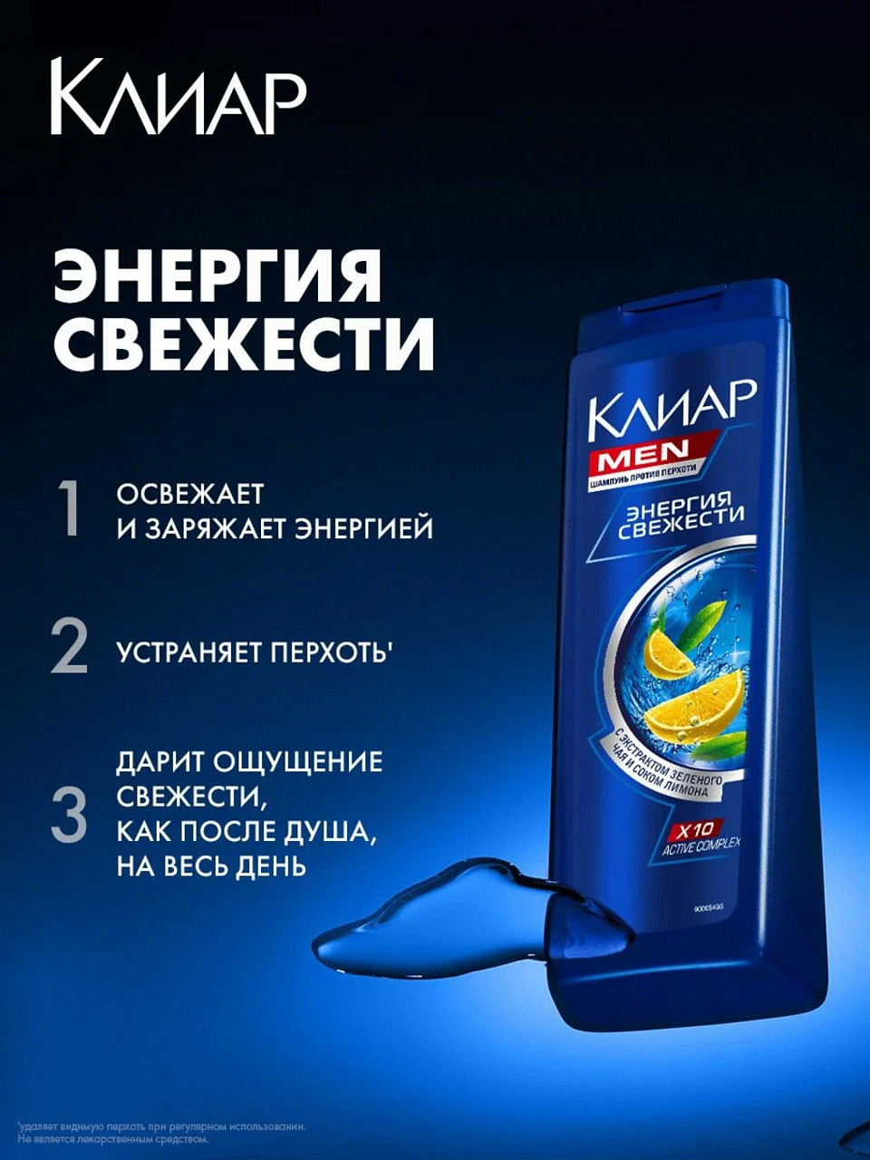 Созданный специально для мужчин Шампунь Clear Энергия свежести дает свежесть волосам и коже головы на весь день. В формулу шампуня входят цитрусовая эссенция и зеленый чай, Он дает максимальное ощущение чистоты и свежести, что особенно важно мужчинам, ведущим активный образ жизни. Комплекс Nutrium 10, входящий в состав шампуня — это насыщенная смесь 10 питательных веществ и растительных активных компонентов. При регулярном применении он помогает активировать естественную защиту кожи головы от перхоти.