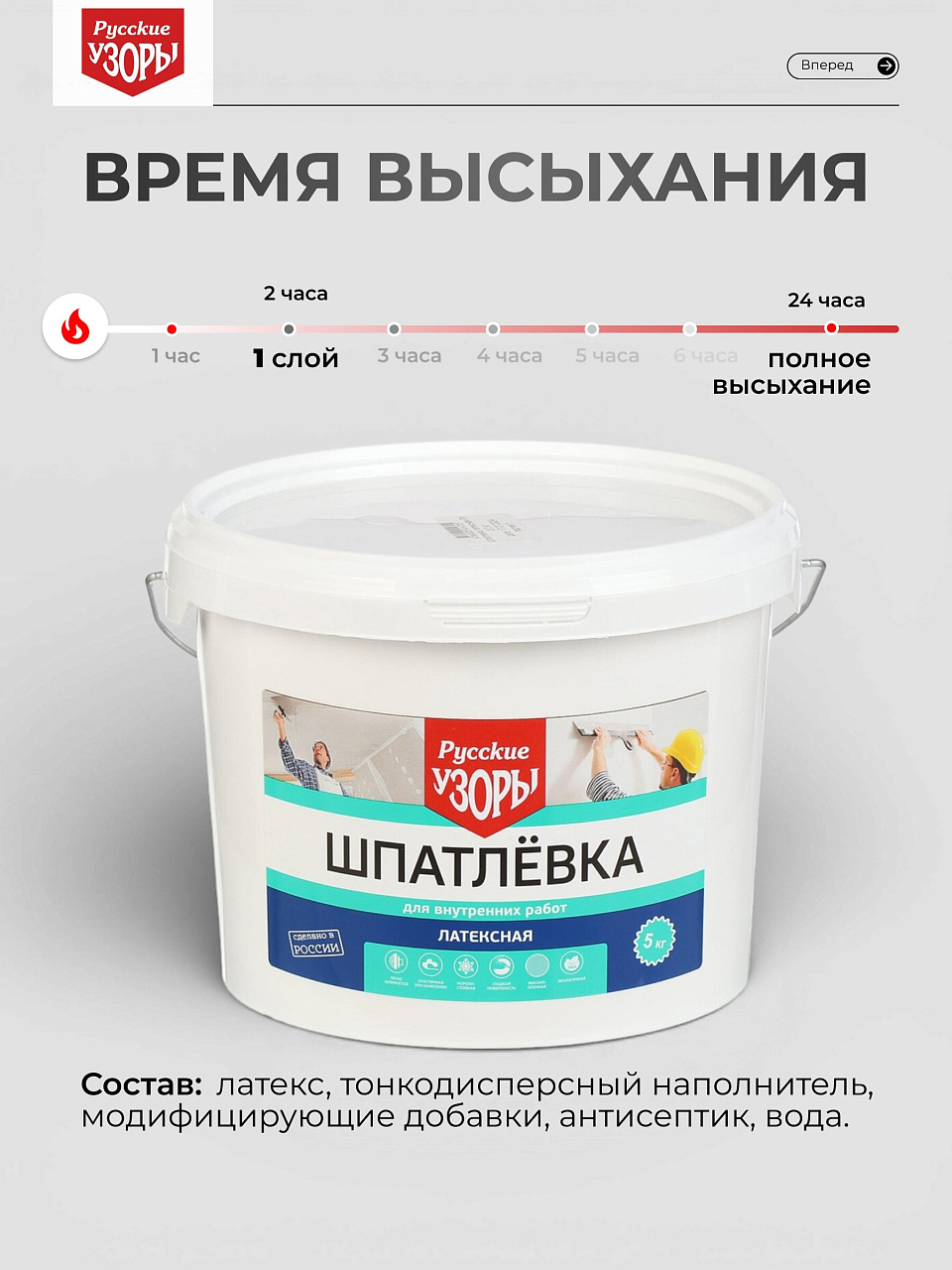 Вы можете приобрести «Шпатлевка Русские узоры, латексная, универсальная, для внутренних работ, 1.5 кг» и другие товары в нашем интернет-магазине в Брянске по низким ценам и с бесплатным самовывозом.