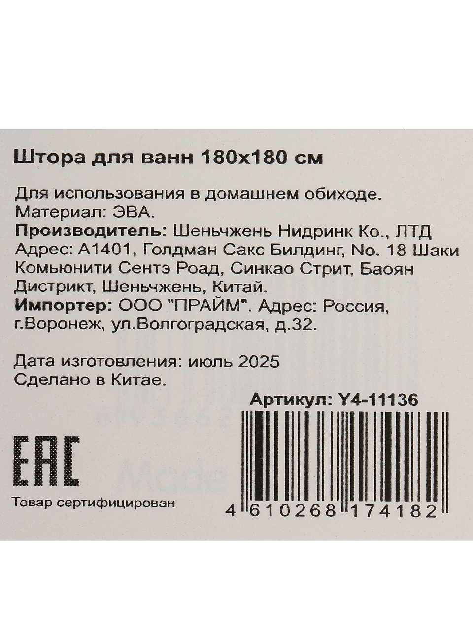 Штора для ванн 180х180 см PEVA: влагозащита, стильный серый цвет, универсальный размер — идеальный выбор для ванной без лишних хлопот.